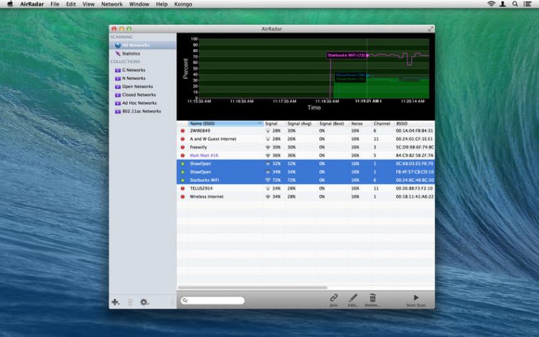 AirRadar เป็นอีกหนึ่งโปรแกรมที่ไม่ควรพลาดบน Mac สำหรับใช้สแกนหาสัญญาณ WiFi รอบตัว เพื่อตรวจสอบว่าสัญญาณ SSID อันไหนที่แรงที่สุด (เช่น TrueWiFi, AISWiFi) นอกจากนี้ยังสามารถดูเป็นกราฟและรายละเอียดอื่นที่สำคัญได้ด้วย