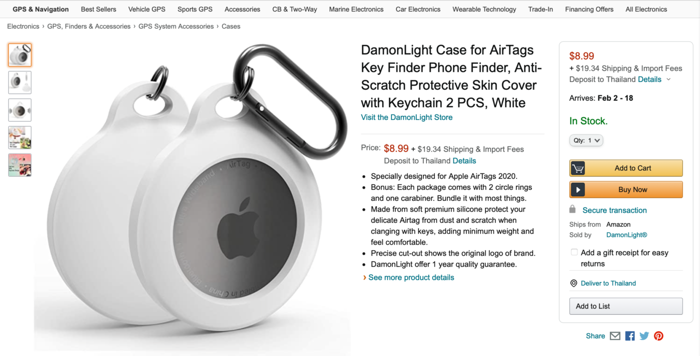 ยังมีสินค้าตัวหนึ่งที่ขายบนเว็บไซต์ Amazon ที่มีลักษณะเป็นพวงกุญแจที่เอาไว้ใส่ AirTags เข้าไปดูสินค้าได้ ที่นี่