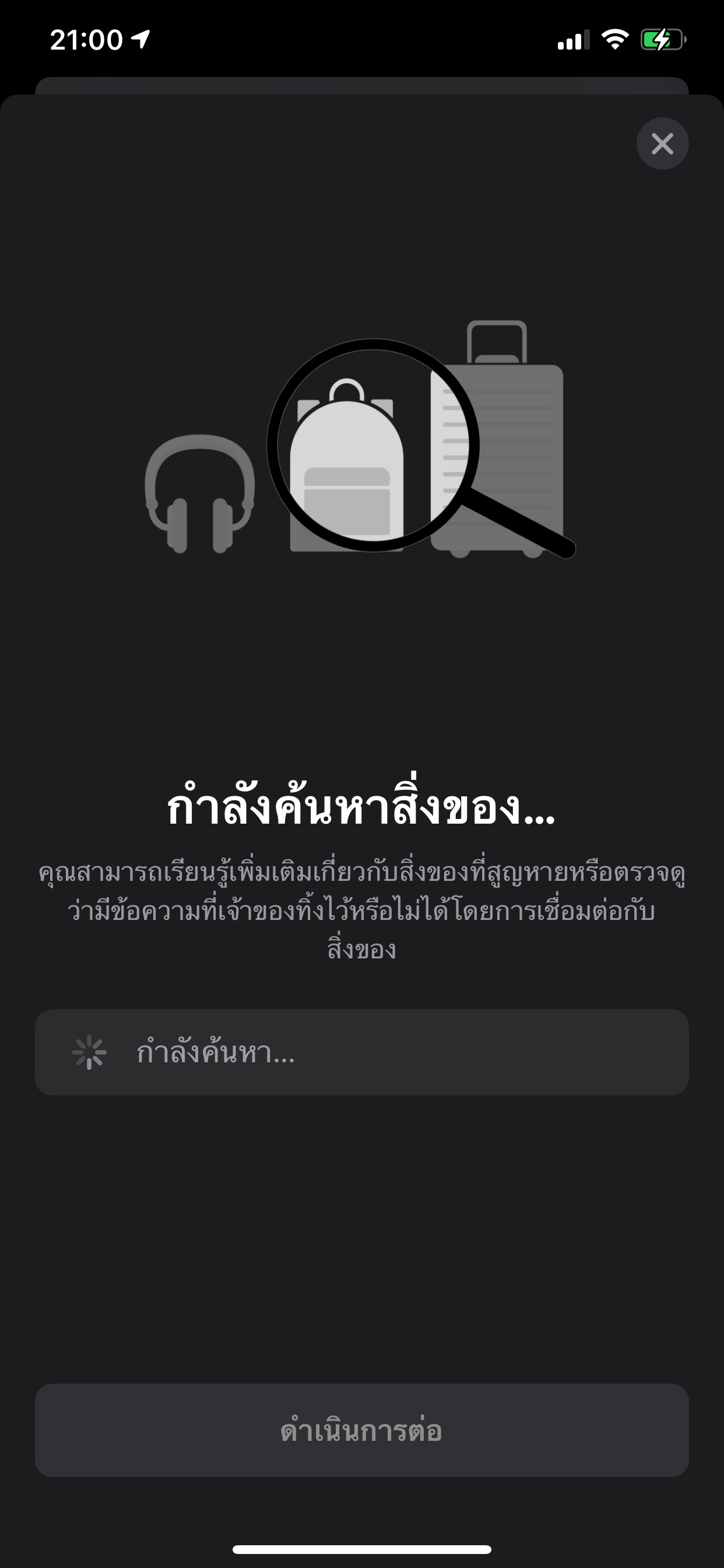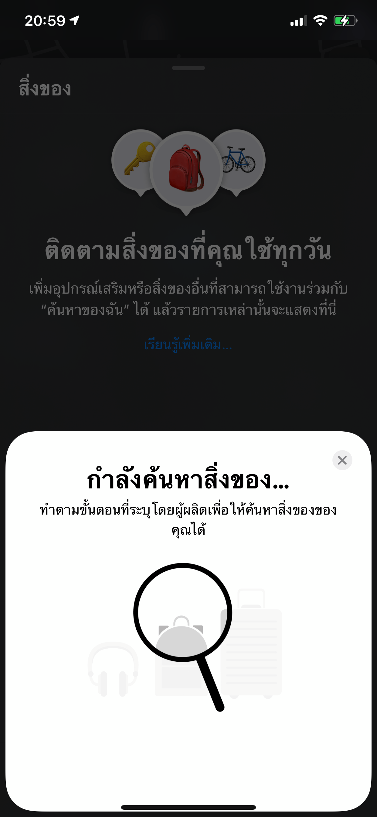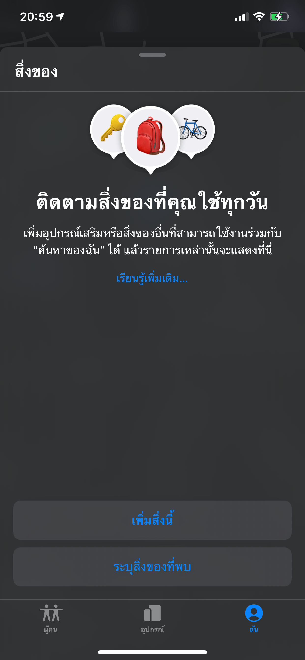 เมื่อลองเปิดใช้งานพบว่ายังไม่สามารถใช้ฟีเจอร์นี้ได้ โดยหน้าต่างแรกจะเป็นการแนะนำให้ตั้งค่าสิ่งของที่สามารถใช้งานร่วมกับ “การค้นหาของฉัน” (Find My) ได้