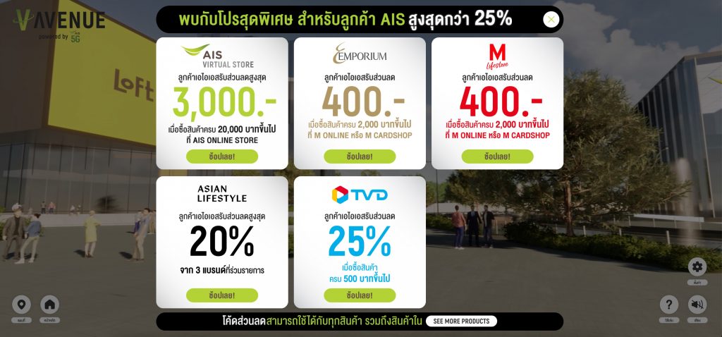 V-Avenue เปิดให้บริการแล้วตั้งแต่วันนี้เป็นต้นไป สามารถเข้าไปสัมผัสประสบการณ์การซื้อสินค้าออนไลน์แบบเสมือนจริงกันได้แล้วที่ https://v-avenue.co/ ลูกค้า AIS จะได้รับสิทธิพิเศษและส่วนลดมากมาย