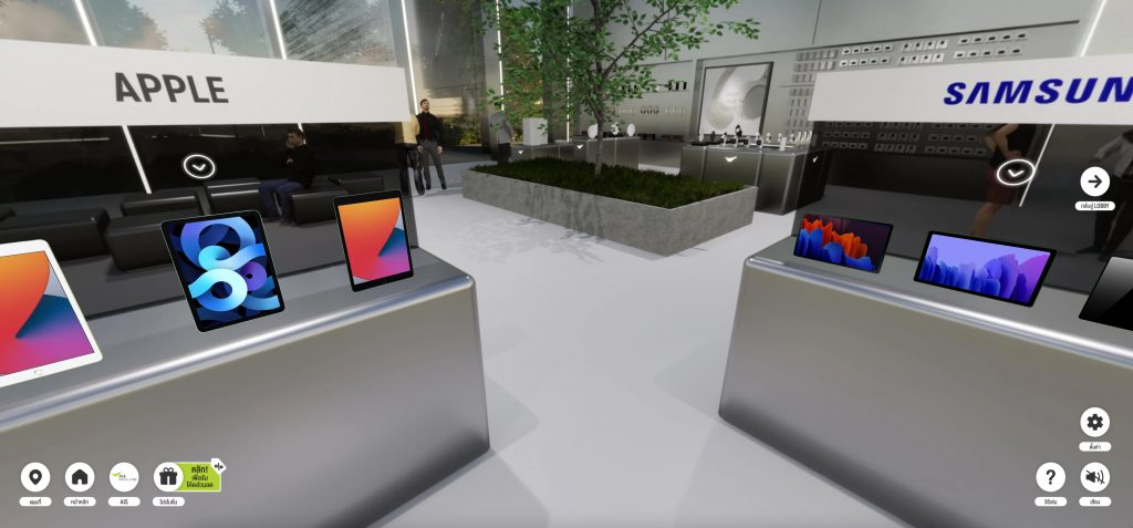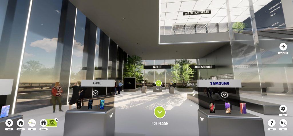 เริ่มต้นด้วย AIS Virtual Store กันก่อนเลย เป็นร้าน AIS Store ที่มี 2 ชั้นด้วยกัน โดยชั้นแรกจะเป็นสมาร์ตโฟนและแท็บเล็ตหลากหลายแบรนด์ให้เลือกซื้อเลือกชม