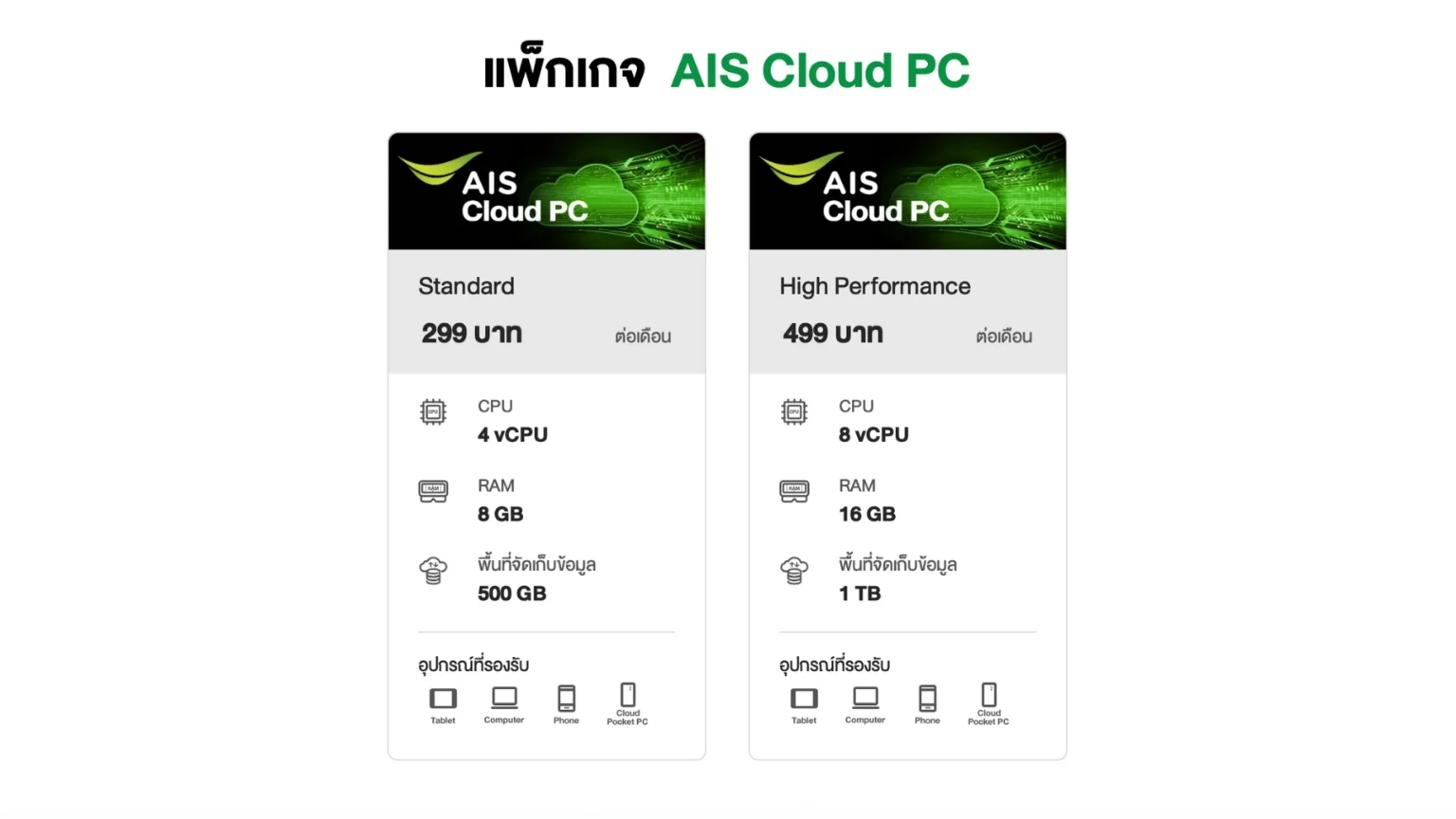 AIS Cloud PC มีให้เลือกหลายแพ็กเกจ เพื่อให้เหมาะกับการใช้งานที่แตกต่างกัน โดยแต่ละแพ็กเกจจะมีสเปคที่แตกต่างกัน เช่น CPU, RAM, พื้นที่เก็บข้อมูล และโปรแกรมสำเร็จรูปที่ติดตั้งมาให้