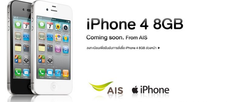 AIS เปิดให้จอง  iPhone4 8GB แล้ววันนี้ โดยไม่ต้องชำระเงินจอง ที่ AIS Shop ทุกสาขา, ร้านเทเลวิซที่ร่วมรายการ, AIS Call Center 1175 และที่ www.ais.co.th/iphone