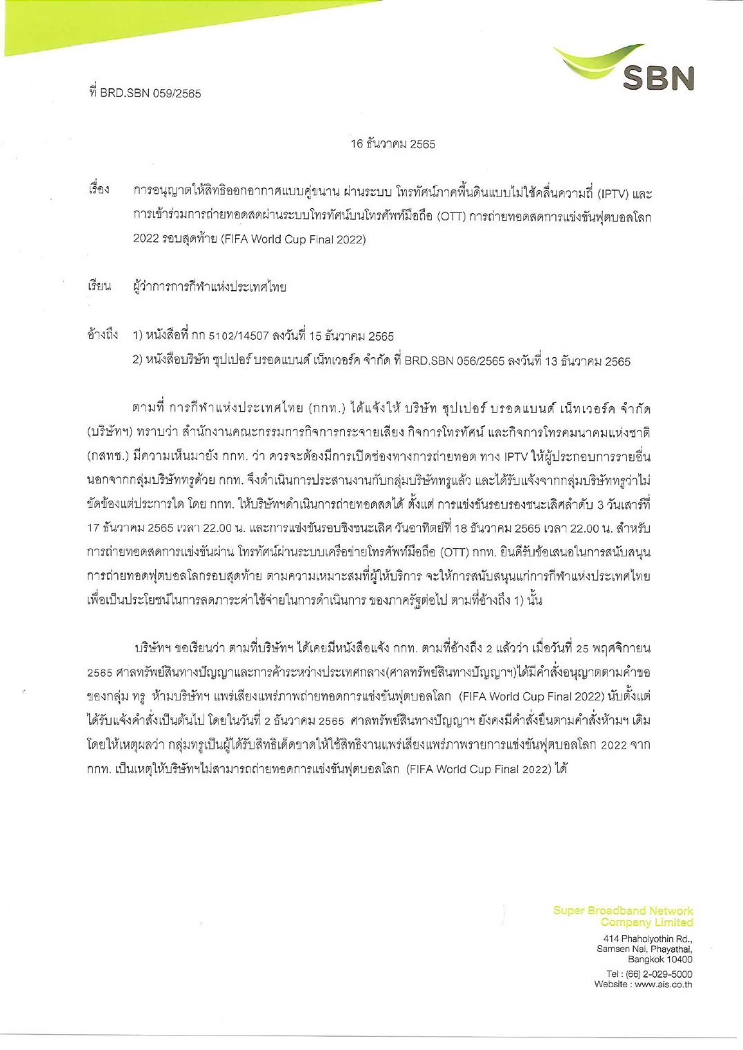 บริษัทฯ จึงได้ทำการส่งหนังสือสอบถามไปยัง 3 หน่วยงานที่เกี่ยวข้องทันที ประกอบด้วย คำร้องต่อศาลทรัพย์สินทางปัญญา หนังสือถึงการกีฬาแห่งประเทศไทย และ กลุ่มทรู เพื่อขอการยืนยันว่า บริษัทฯ สามารถถ่ายทอดสดการแข่งขันฟุตบอลโลก 2022 รอบสุดท้าย ตามประกาศ คณะกรรมการกิจการกระจายเสียง กิจการโทรทัศน์ และ กิจการโทรคมนาคม เรื่องหลักเกณฑ์การเผยแพร่กิจการโทรทัศน์ที่ให้บริการเป็นการทั่วไป หรือ ประกาศ Must Carry หรือไม่ เนื่องจากที่ผ่านมา ศาลทรัพย์สินทางปัญญาฯ ได้มีคำสั่งห้ามบริษัทฯ ถ่ายทอดการแข่งขันฟุตบอลโลก (FIFA World Cup Final 2022) ตามคำขอของกลุ่ม ทรู และยังมิได้มีการยกเลิกคำสั่งดังกล่าว โดยถึงขณะนี้ บริษัท เองก็ยังไม่ได้รับคำตอบจากศาลทรัพย์สินทางปัญญา กกท. และ กลุ่มทรู แต่อย่างใด ดังนั้น บริษัทฯ จึงยังไม่สามารถดำเนินการถ่ายทอดสดฟุตบอลโลก 2022 ได้
