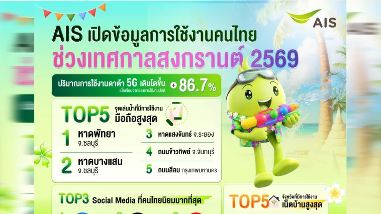 AIS เผยอินไซต์ การใช้งานเครือข่ายช่วงสงกรานต์ 2569 พบการเติบโตของ 5G สูงถึง 86% พร้อมพฤติกรรมใช้งานดิจิทัลและการท่องเที่ยวที่เพิ่มขึ้นต่อเนื่องทั่วประเทศ