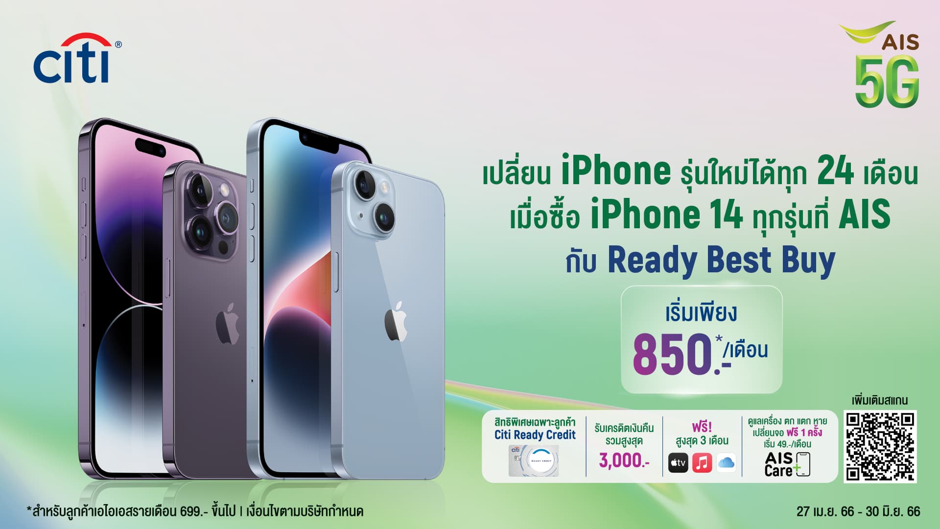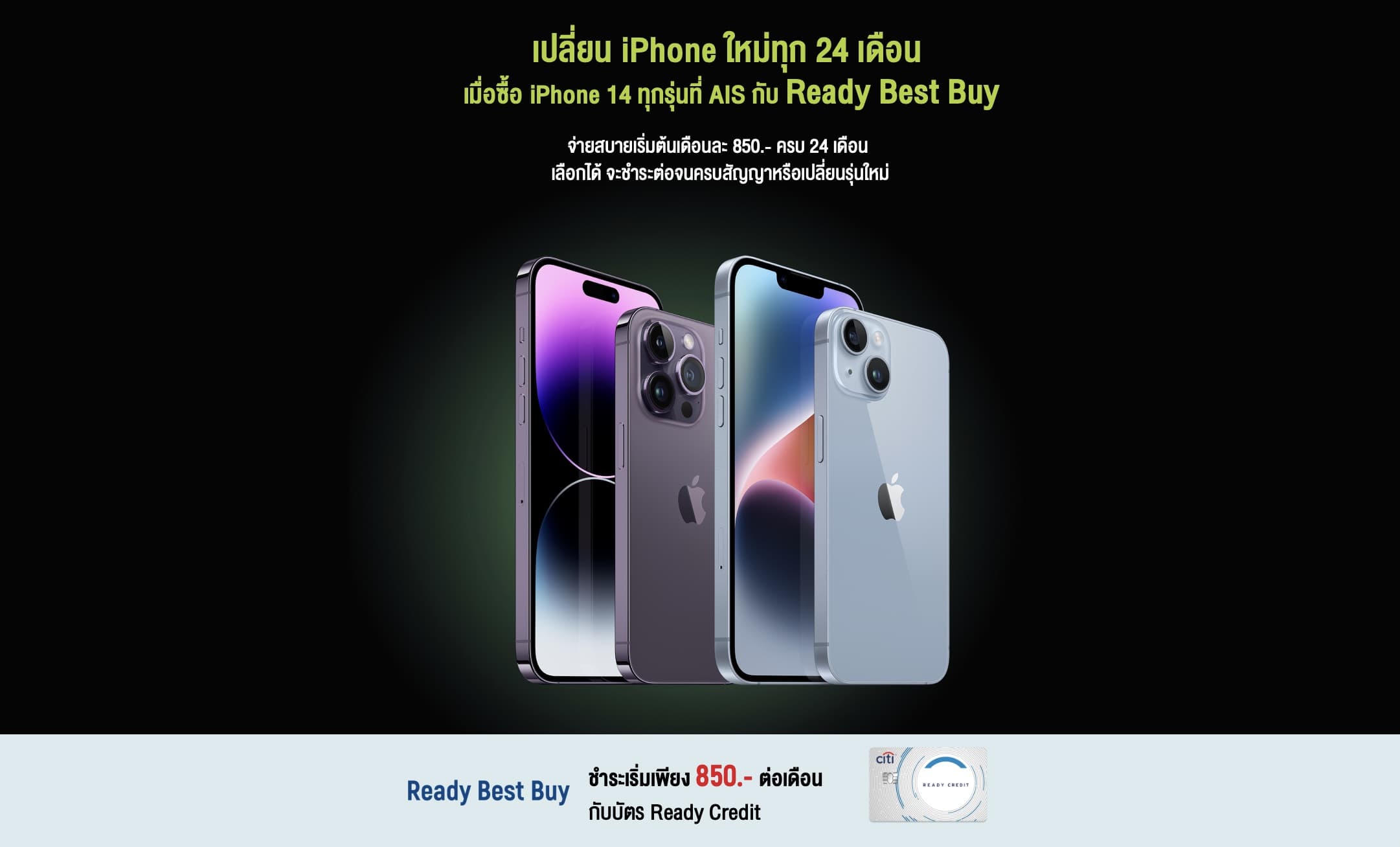 ครั้งนี้ยังคงทำงานร่วมกับสถานบันทางการเงินอย่างต่อเนื่อง เพื่อขยายรูปแบบและวิธีการให้ลูกค้ามีทางเลือกใหม่ ๆ ที่เพิ่มมากขึ้น โดยล่าสุดได้ส่งแคมเปญ Ready Best Buy ให้ลูกค้าซื้อ iPhone 14 ทุกรุ่นที่ AIS ผ่านบัตร Citi Ready Credit กับข้อเสนอจ่ายเริ่มต้นเพียงเดือนละ 850 บาท และเมื่อชำระครบ 24 เดือน สามารถเลือกชำระต่อจนครบสัญญาหรือสามารถเปลี่ยนรุ่นใหม่ได้เลย