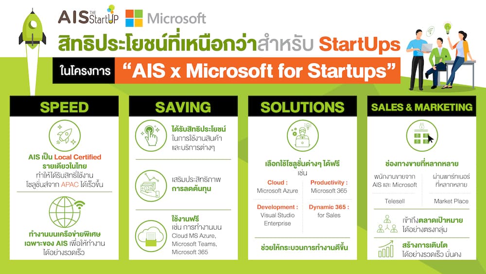 - ความเร็ว (Speed) จากการเป็นพันธมิตรร่วมกันที่แข็งแกร่ง ทำให้ Startup ที่เข้าร่วมโครงการ “AIS x Microsoft for Startups” จะผ่าน APAC ซึ่งนับว่าเป็นการลดขั้นตอนในการเข้าถึงบริการของ Microsoft ได้เร็วยิ่งขึ้นซึ่ง AIS เป็น Local Certified หรือการให้สิทธิ์ของโปรแกรมเพียงรายเดียวในไทย อีกทั้งยังสามารถทำงานบนเครือข่ายพิเศษเฉพาะของ AIS เพื่อให้ทำงานได้อย่างรวดเร็ว