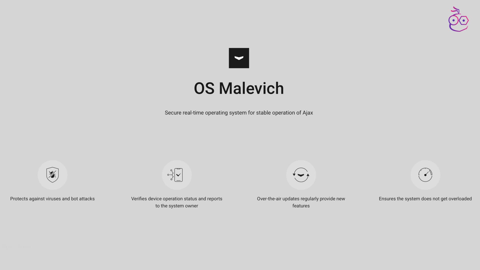 AJAX มี OS ของตัวเอง เพื่อทำให้อุปกรณ์ทำงานอย่างลื่นไหลและปลอดภัยจากไวรัส โดยใช้ OSMalevich เป็นตัวที่จะช่วยอัปเดตแบบ OTA ให้กับอุปกรณ์ทั้งหมดได้อย่างสะดวก มีเทคโนโลยีไร้สายของตนเอง