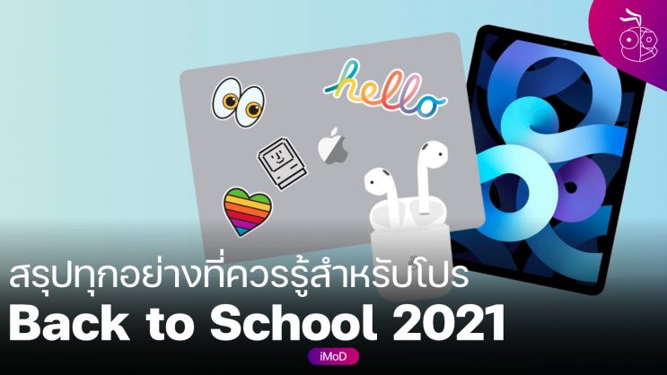 Apple Back to School เป็นโปรโมชันที่ออกมาเพื่อต้อนรับน้อง ๆ นักศึกษาในช่วงการเปิดเทอม ซึ่งในปี 2021 ถือว่าปีที่ 2 ที่ทาง Apple ได้จัดในประเทศไทย ซึ่งหากผู้ใช้ซื้อ iPad และ Mac ในราคาเพื่อการศึกษาที่ร่วมรายการจะได้ของแถมเป็น AirPods รุ่นที่ 2 และทั้งนี้สามารถอัปเกรดเป็น AirPods Pro ได้ด้วย รายละเอียดต่าง ๆ ทีมงานได้ทำคลิปสรุปไว้ให้แล้วพร้อมทั้งข้อสงสัยอื่น ๆ สามารถรับชมตามแต่ละรายการได้เลย