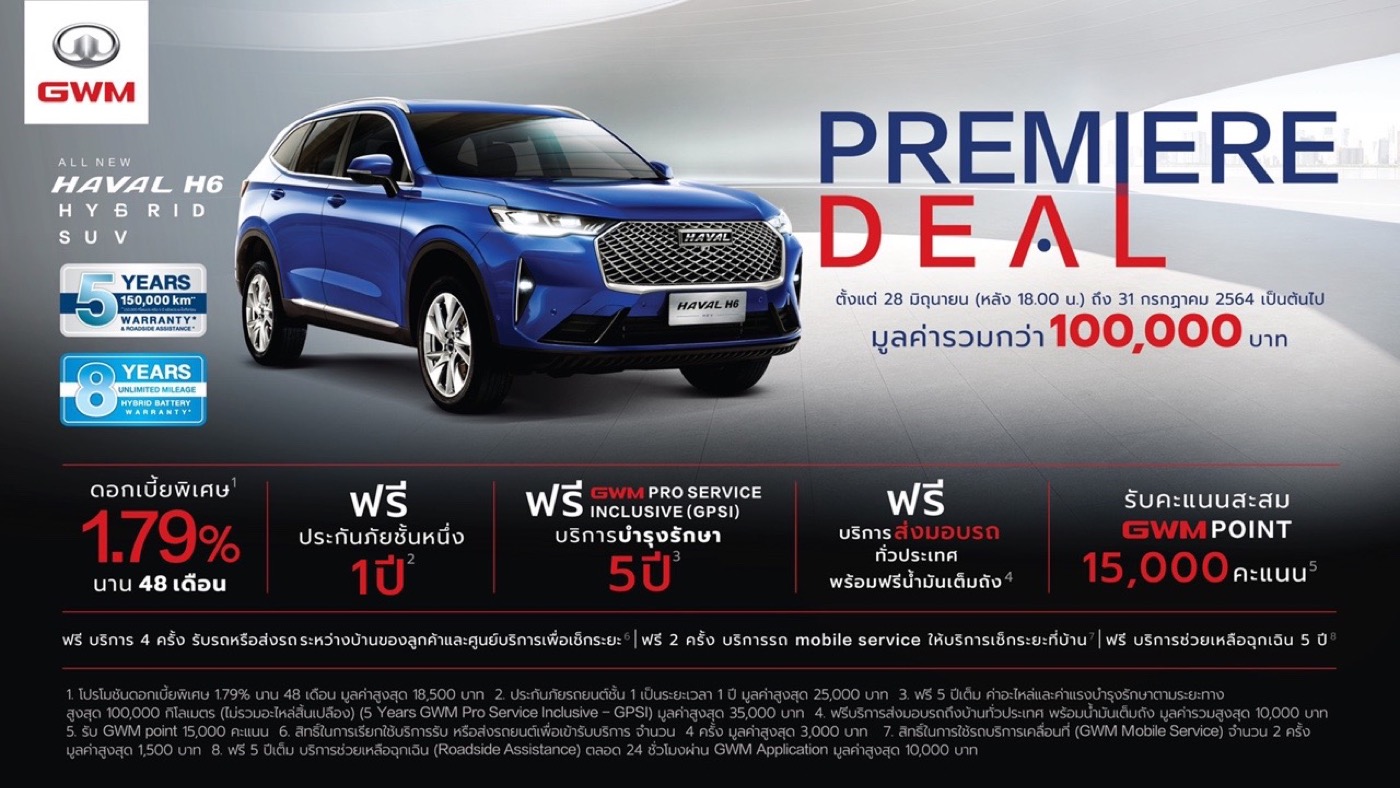 All New HAVAL H6 Hybrid SUV มาพร้อมกับแคมเปญสุดพิเศษ Premiere Deal ช่วงเปิดตัว ทั้งดอกเบี้ยพิเศษ 1.79% นาน 48 เดือน ฟรีประกันภัยชั้นหนึ่ง 1 ปีเต็ม แพ็กเกจบำรุงรักษา GWM PRO Service Inclusive (GPSI) 5 ปี หรือ 100,000 กิโลเมตร และสิทธิพิเศษอื่นๆ อีกมากมาย รวมมูลค่ากว่า 100,000 บาท