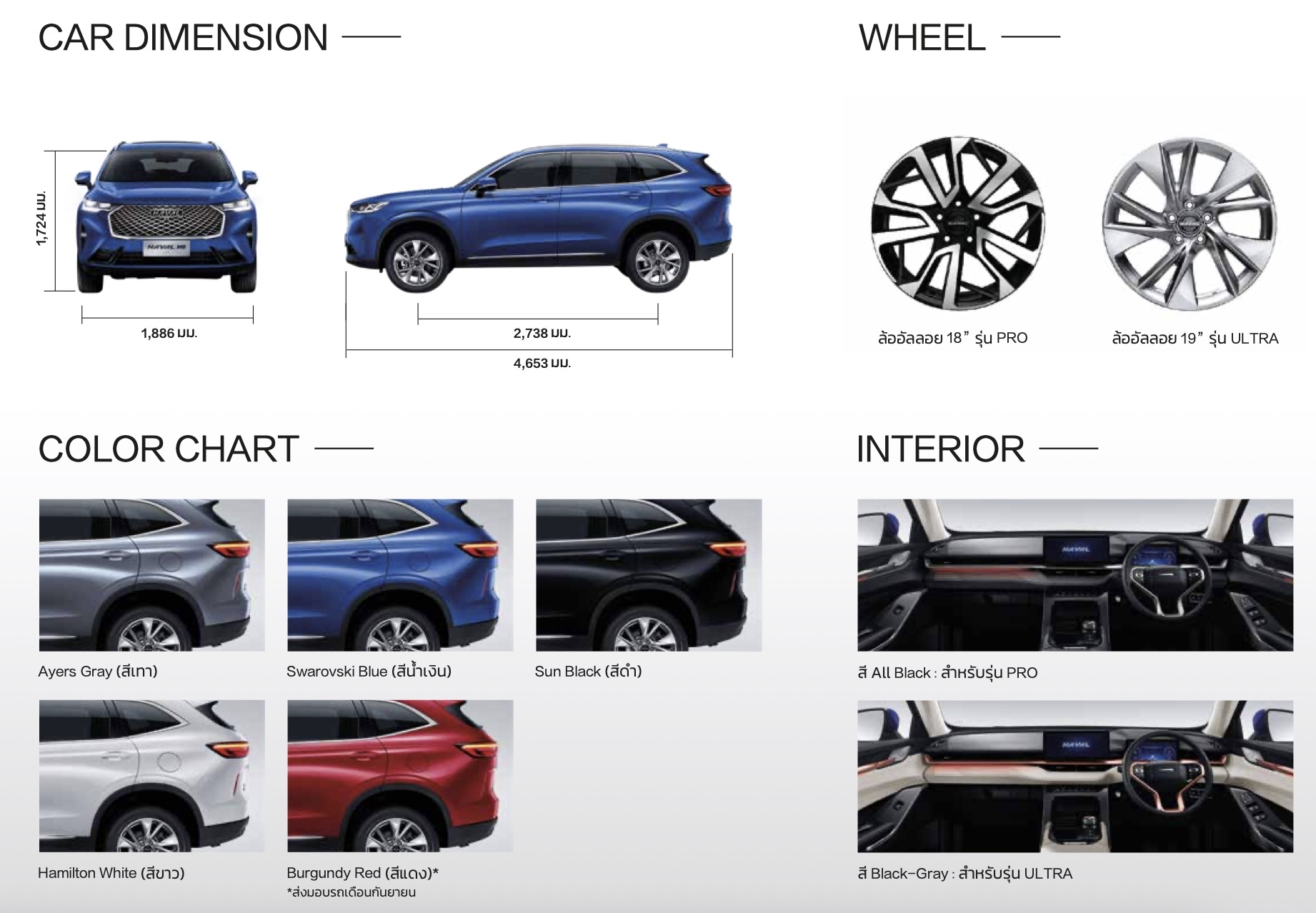 All New HAVAL H6 Hybrid SUV นับเป็นรถ SUV ที่ได้รับความนิยมมากที่สุดในประเทศจีน ด้วยยอดขายมากกว่า 3,500,000 คันทั่วโลก ที่มาพร้อมดีไซน์ภายนอกอันโดดเด่น ด้วยกระจังหน้าที่เป็นเอกลักษณ์ แบบ Classic Geometric Pattern แบบ 3 มิติ และไฟหน้า Intelligent LED เพิ่มความมั่นใจและความปลอดภัยในการขับขี่ยามค่ำคืน พร้อมไฟท้าย LED Taillight Strip พาดยาวจากซ้ายจรดขวาเป็นเอกลักษณ์เฉพาะตัวที่ไม่เหมือนใคร และล้ออัลลอยดีไซน์สปอร์ตขนาดใหญ่กว่า 19 นิ้ว ในส่วนของดีไซน์ภายใน มีการตกแต่งสไตล์ Minimalist เรียบง่ายแต่หรูหรา มีการใช้สีแบบ Two-tone และมีหน้าจอที่สามารถเชื่อมต่อกันได้ถึง 3 หน้าจอ ไม่ว่าจะเป็นหน้าจออัจฉริยะแบบ Touch screen ขนาด 12 นิ้ว หน้าจอ Multi information display ขนาด 10 นิ้ว และ Head Up Display ขนาด 9 นิ้ว ที่กระจกด้านหน้า และมาพร้อมชุดเกียร์ไฟฟ้าดีไซน์ล้ำสมัย มีแท่นชาร์จโทรศัพท์แบบไร้สาย เพื่อความสะดวกสบายมากยิ่งขึ้น