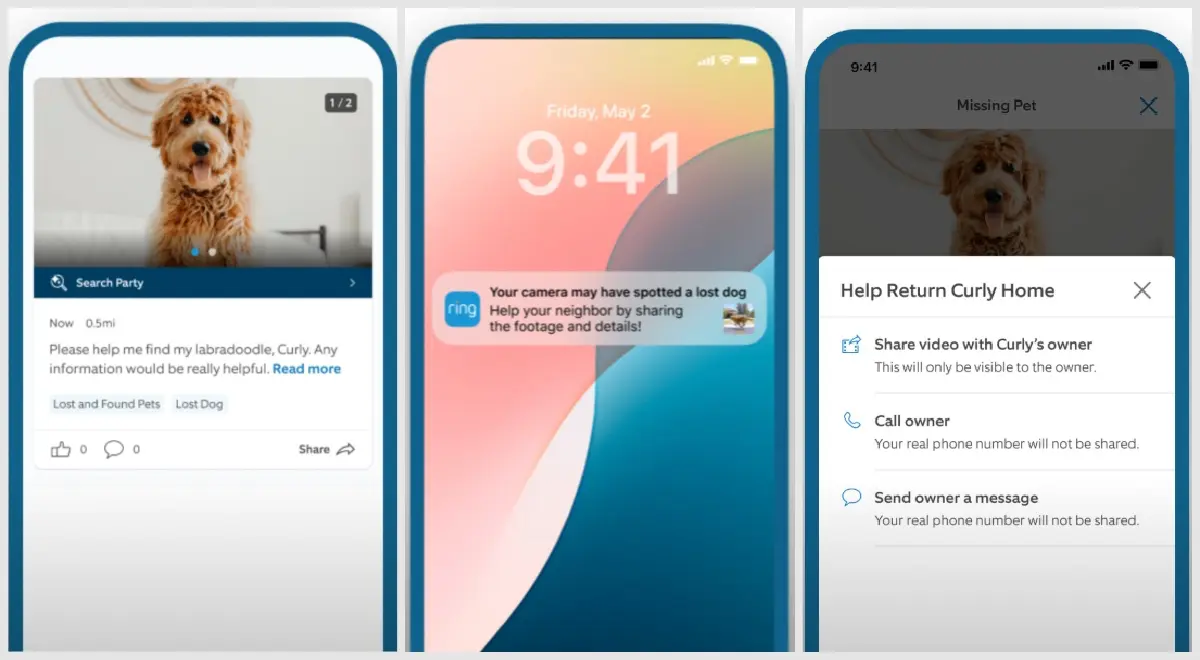 เมื่อมีโพสต์สุนัขหายในแอป ระบบจะเริ่มต้นฟังก์ชัน Search Party และจะมีการแจ้งเตือนให้ผู้ใช้กล้อง Ring ที่อยู่ในพื้นที่ใกล้เคียงทราบ