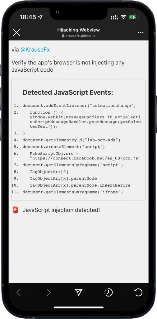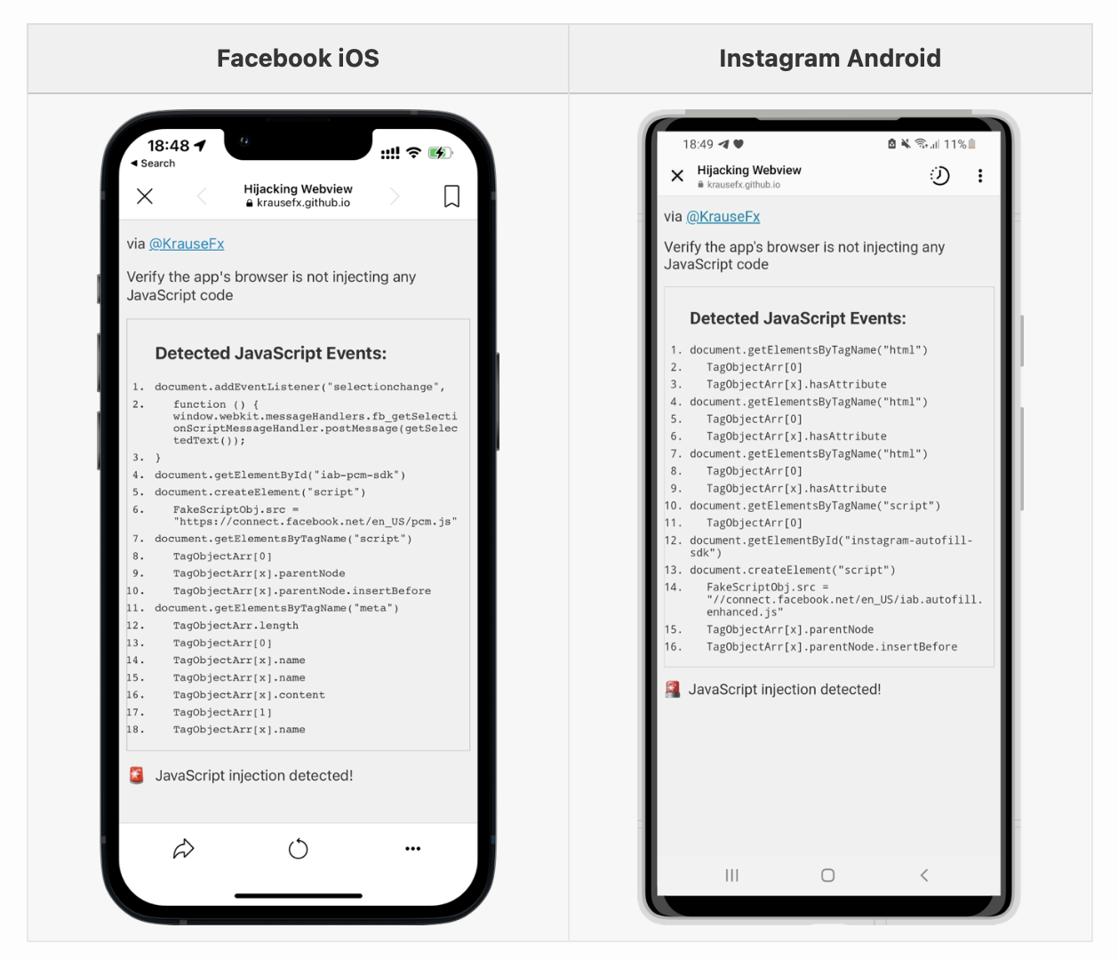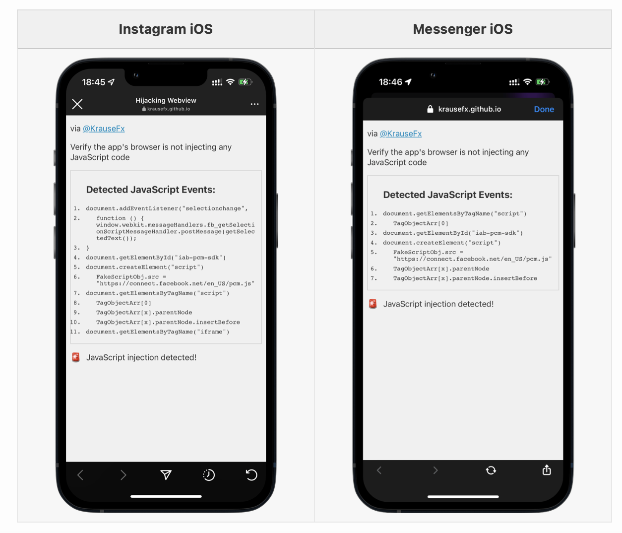 การวิเคราะห์นี้ วิเคราะห์โดย Felix Krause พบว่าทั้ง Instagram และ Facebook บนอุปกรณ์ iOS ใช้เบราว์เซอร์ในแอปของบริษัทตัวเองเพื่อโหลดเว็บไซต์ภายในแอป แทนที่จะเป็นเบราว์เซอร์ของ Apple