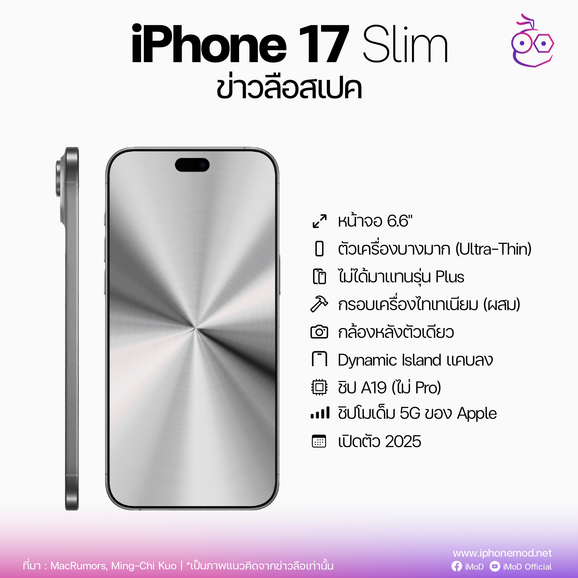 ต่อมาก็คือ “iPhone 17 Slim, iPhone 17 Air” ที่จะเป็นรุ่นดีไซน์ใหม่ที่มีข่าวลือว่าจะเป็นรุ่นเครื่องบาง (คล้าย iPad Pro ชิป M4) มาพร้อมสเปคที่ทันสมัย (ชิปโมเด็ม 5G ของ Apple) และ iPhone 17 Air อาจมาแทนที่ iPhone 17 Plus อยู่ตรงกลางระหว่าง iPhone 17 และ iPhone 17 Pro ทำให้อาจเป็นจุดสนใจที่ทำให้ผู้ใช้ iPhone มากขึ้นด้วย