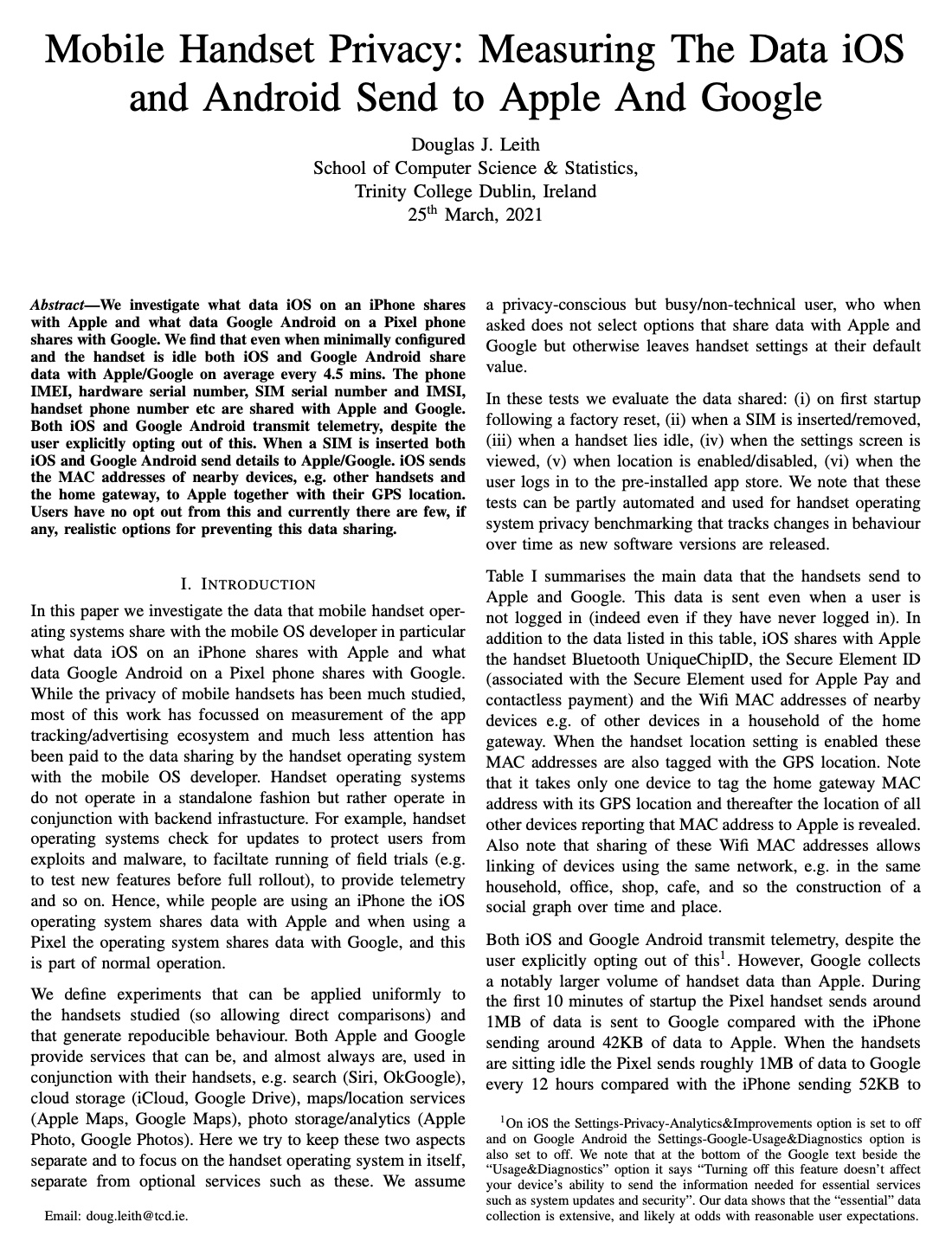 ในงานวิจัยของ Leith ได้ยกตัวอย่างว่า ตอนเปิดอุปกรณ์, Android ได้เก็บและส่งข้อมูลผู้ใช้ขนาด 1MB ไปยัง Google, โดยใน iOS ส่งข้อมูลเพียง 42KB เท่านั้น และในรายงานระบุว่า Android ส่งข้อมูลประมาณ 1MB ไปยัง Google ใน 12 ชั่วโมง, Apple ส่งข้อมูลเพียง 52KB ในระยะเวลาเท่ากัน