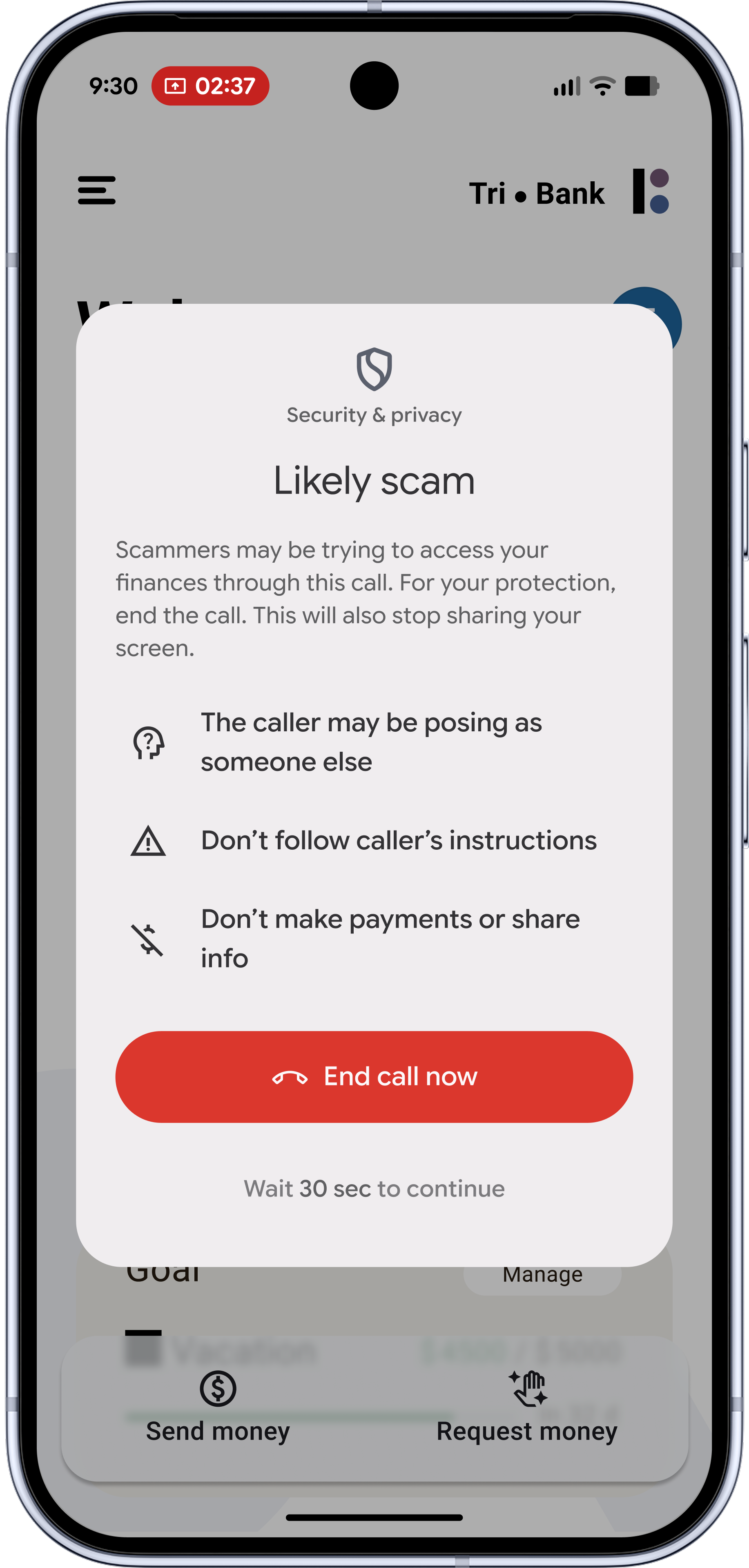 Google เพิ่มประสิทธิภาพความปลอดภัยให้ Android ด้วยฟีเจอร์ใหม่ ที่จะเตือนเมื่อเกิดความเสี่ยงจากการแชร์หน้าจอระหว่างพูดคุยทางโทรศัพท์ หากมีผู้ไม่รู้จักพยายามหลอกขอข้อมูลการเงิน