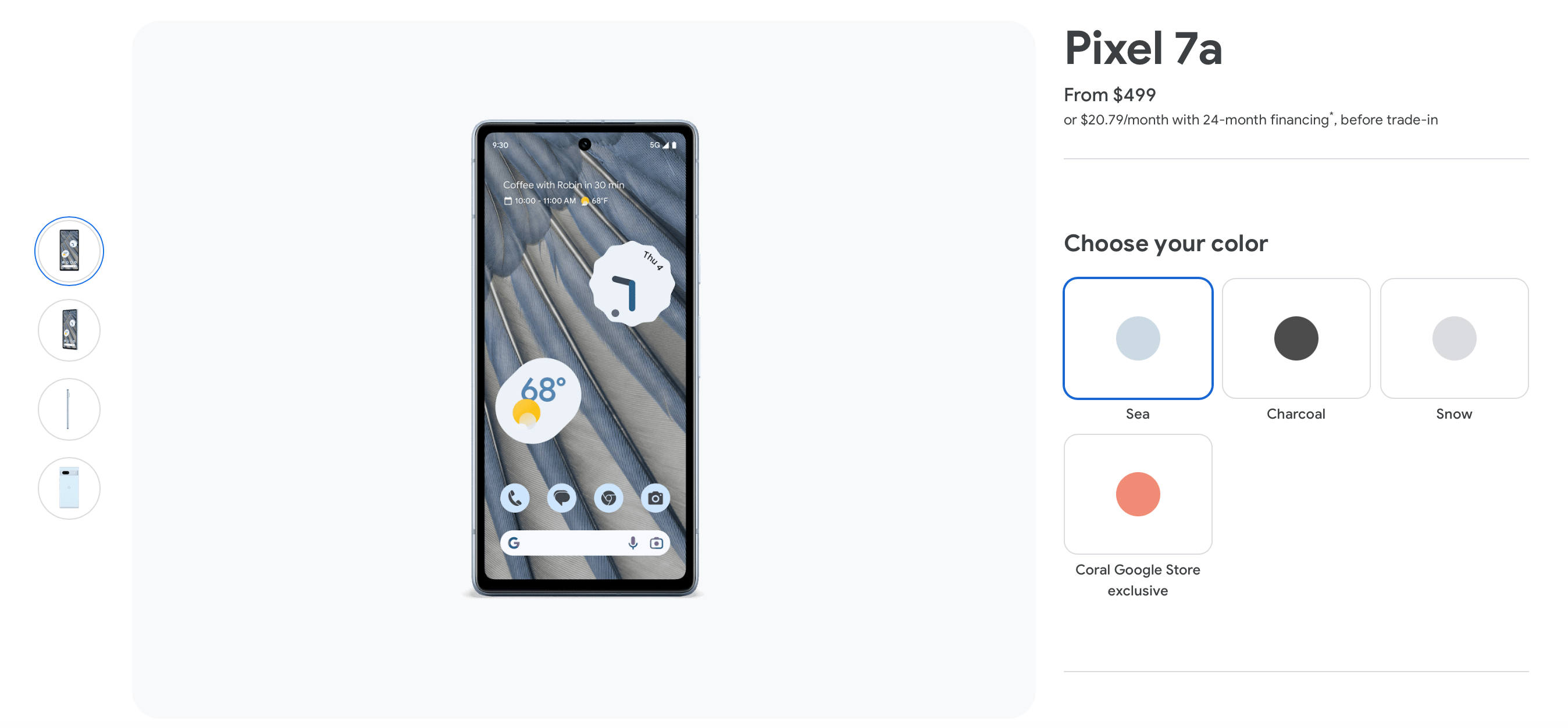 สำหรับ Google Pixel 7a นั้น ณ ปัจจุบันยังไม่เปิดให้สั่งจองในประเทศไทย โดยราคาจะอยู่ที่ $499 = ประมาณ 16,XXX บาท มีให้เลือก 4 สี คือ Coral, Sea, Charcoal และ Snow
