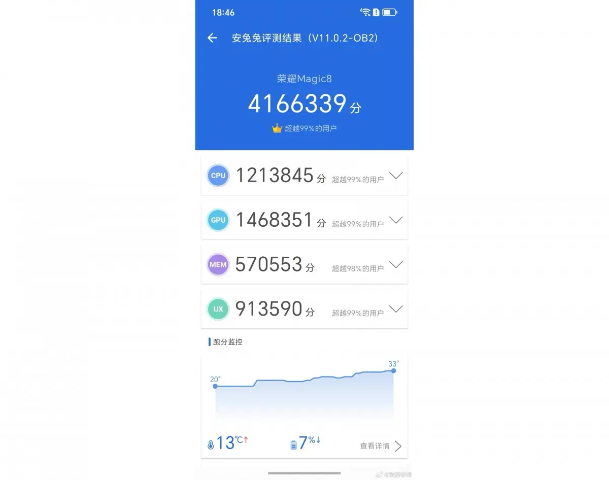 Li Kun จาก Honor ได้แชร์ผลการทดสอบ AnTuTu ของ Magic8 ผ่าน Weibo จากภาพหน้าจอด้านล่าง แสดงให้เห็นว่าเครื่องทำคะแนนรวมบน AnTuTu v11 ได้ 4,166,339 คะแนน โดยแบ่งเป็น CPU 1,213,845 คะแนน, GPU 1,468,351 คะแนน, หน่วยความจำ 570,553 คะแนน, และ UX 913,590 คะแนน