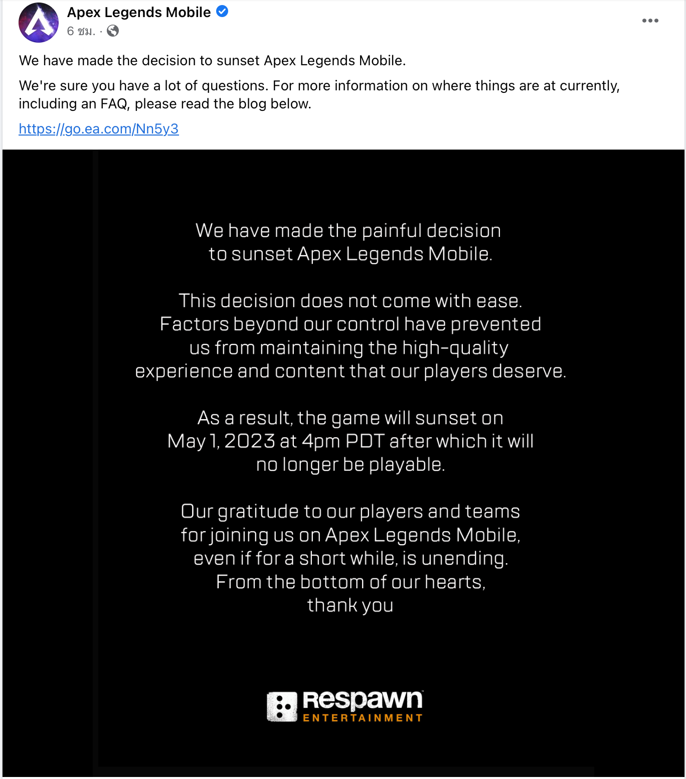 ถือว่าเป็นเรื่องที่น่าตกใจเลยทีเดียว เมื่อเกมยอดฮิตบนมือถืออย่างเกม Apex Mobile ประกาศปิดให้บริการ ในวันที่ 1 พ.ค. นี้!