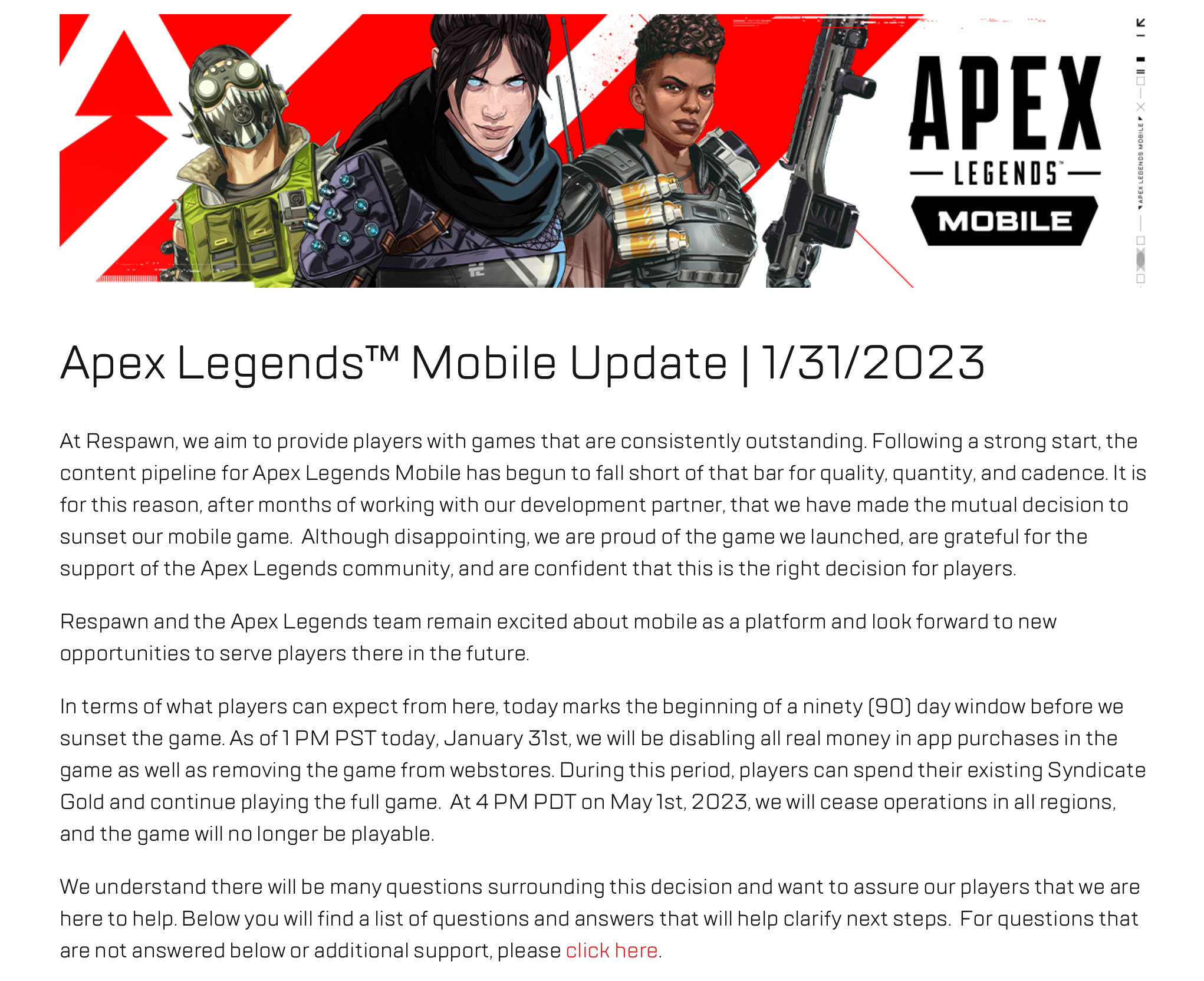ล่าสุด Respawn ได้ประกาศยุติให้บริการตัวเกม Apex Legends Mobile ซึ่งถือว่าน่าเสียดายเป็นอย่างมาก เพราะจากประสบการณ์ส่วนตัวที่เล่นเกมนี้มาบนสมาร์ตโฟน เกมนี้ถือว่าเป็นหนึ่งเกมที่เล่นแล้วสนุกเป็นอย่างมาก