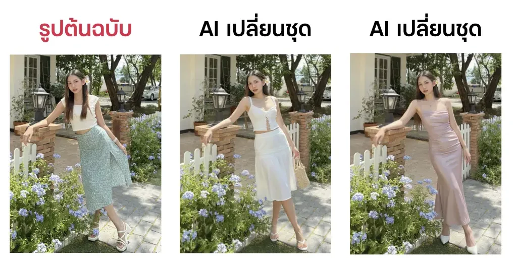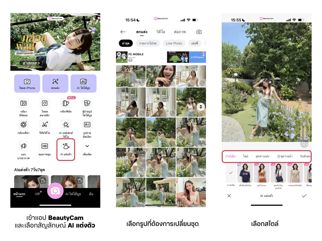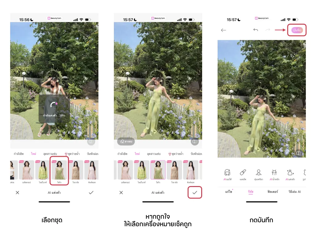 เมื่อเข้ามาที่หน้าแอป BeautyCam ให้หาสัญลักษณ์ AI แต่งตัว > เลือกรูปที่ต้องการเปลี่ยนชุด > เลือกสไตล์ชุด > เลือกชุดที่ชอบ > เมื่อถูกใจแล้วให้กด เครื่องหมายเช็คถูก > บันทึกรูป