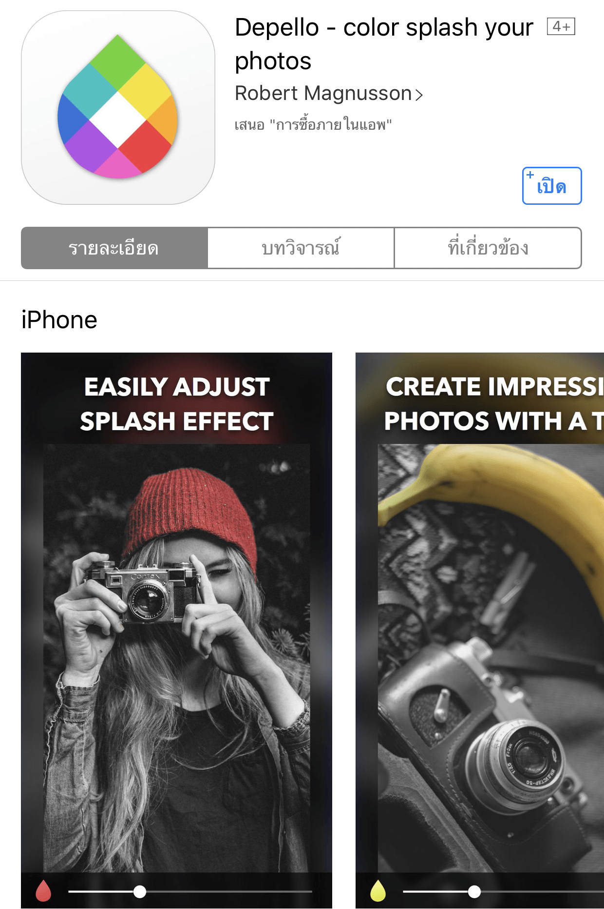Depello – color splash your photos ราคา 1.99 เหรียญ ฟรี แอปทำรูปภาพแนวสแปลช(รูปภาพขาวดำเหลือไว้แต่ส่วนที่เป็นสีที่ผู้ใช้งานต้องการเท่านั้น) ที่ง่ายและสมจริงที่สุด เพียงแค่จิ้มจุดที่ผู้ใช้งานต้องการดูดสีเอาไว้ ตัวแอพจะวิเคราะห์และทำภาพสแปลชออกมาตามที่ผู้ใช้งานต้องการทันที