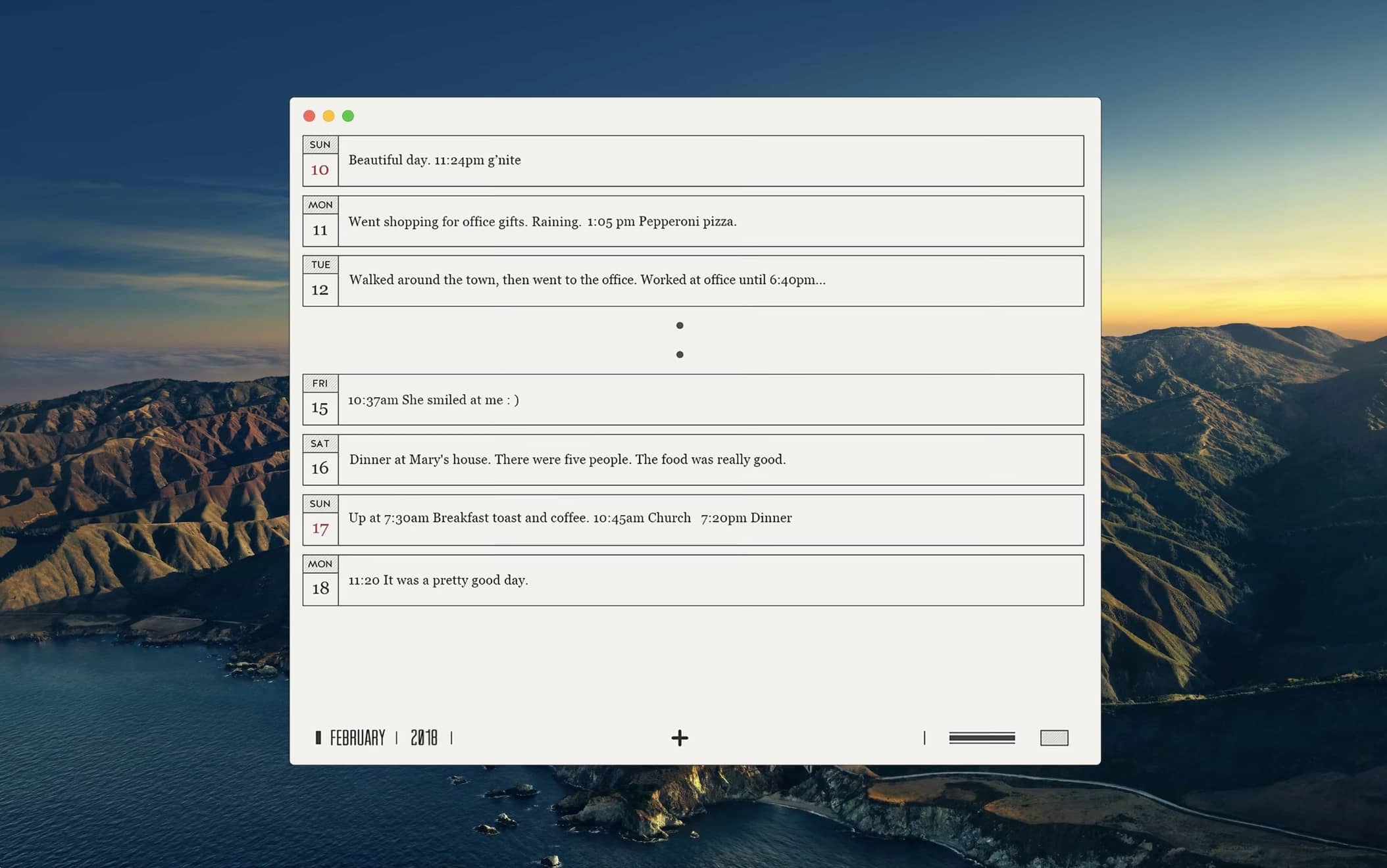 แอปไดอารี่ที่มีความเรียบง่าย ใช้งานง่าย และไม่ยุ่งยากเกินไป เหมาะสำหรับมือใหม่  ตัวแอปก็เป็นสีที่ดูสะอาดตา ทำให้รู้สึกสบายใจ