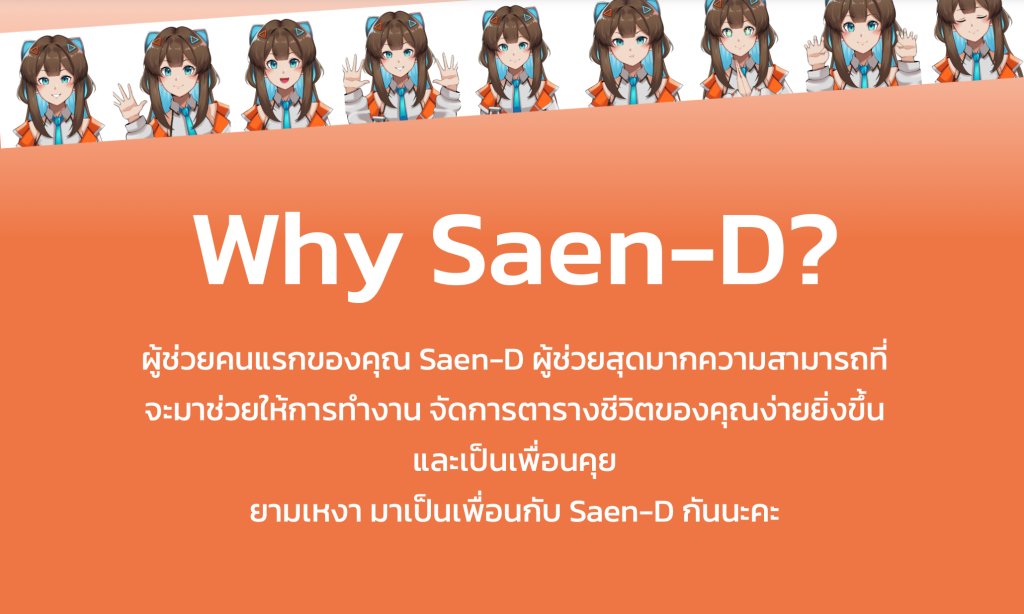 Saen-D คือแอปผู้ช่วยส่วนตัวที่ปฏิวัติวงการด้วยการผสมผสานเทคโนโลยี AI ล้ำสมัยเข้ากับตัวละครที่น่าดึงดูด เพื่อช่วยผู้ใช้เพิ่มประสิทธิภาพการทำงานความสะดวกสบาย และการผ่อนคลายขณะใช้แอปพลิเคชัน