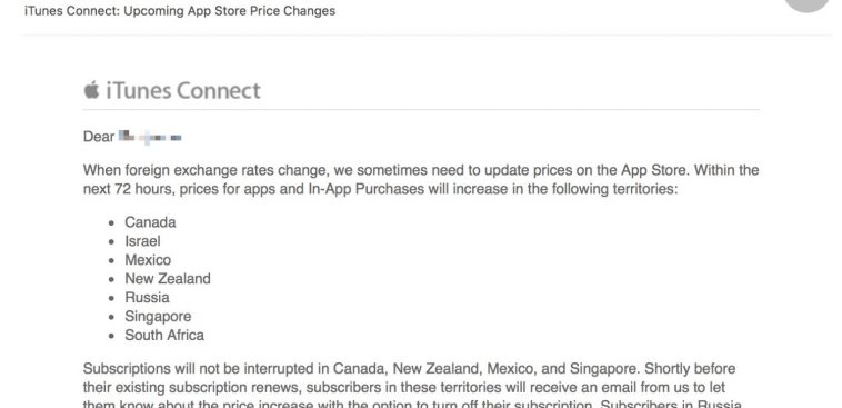 นักพัฒนาซอฟต์แวร์ได้รับการแจ้งเตือนจาก Apple เกี่ยวกับราคาที่วางขายใน App Store ของประเทศแคนนาดา, อิสราเอล, เม็กซิโก, นิวซีแลนด์, รัสเซีย, สิงคโปร์และแอฟริกาใต้ เกี่ยวกับการเพิ่มราคา App และ In-app purchases ภายใน 72 ชั่วโมง