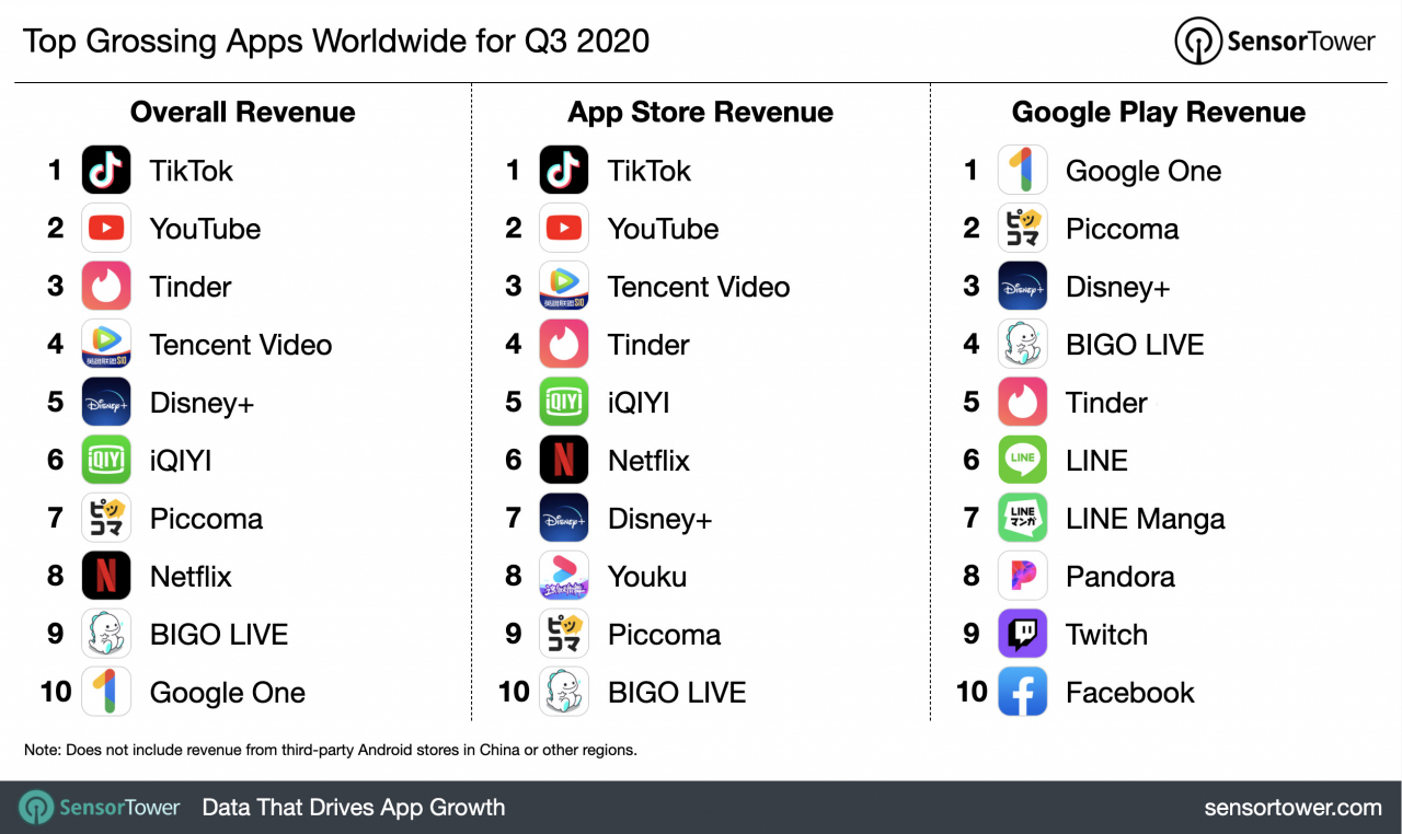 App Store ของ Apple ทำรายได้มากกว่า Google Play Store เกือบ 2 เท่าในไตรมาส 3 ปี 2020 โดย Tik Tok เป็นแอปที่มียอดใช้จ่ายสูงสุด