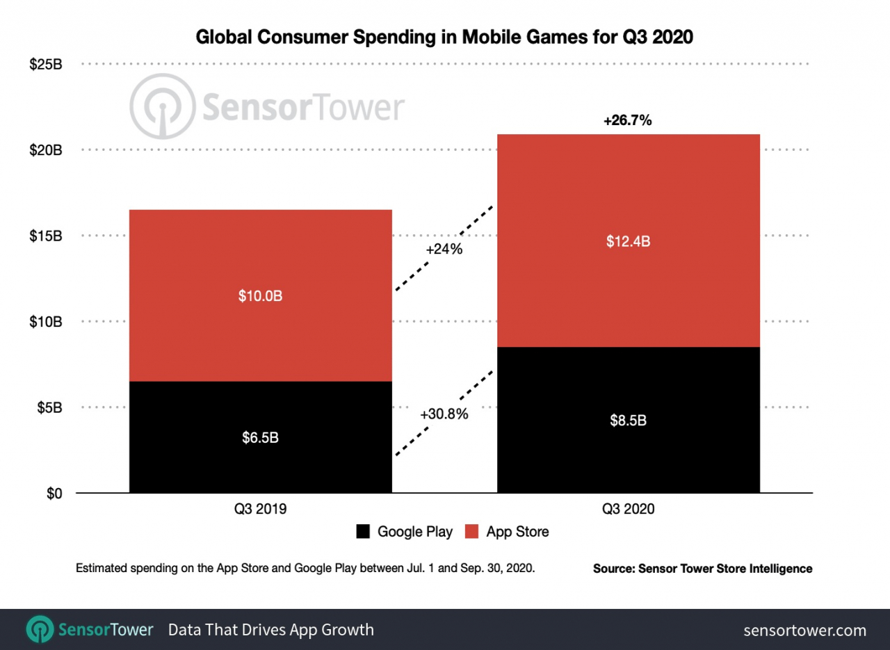 แอปเกมนั้นทำรายได้เพิ่มขึ้นมากเหมือนกัน โดยรวมแล้วเพิ่มขึ้นจากปีที่แล้ว 26.7% มียอดใช้จ่ายสูงถึง 20,900 ล้านดอลลาร์