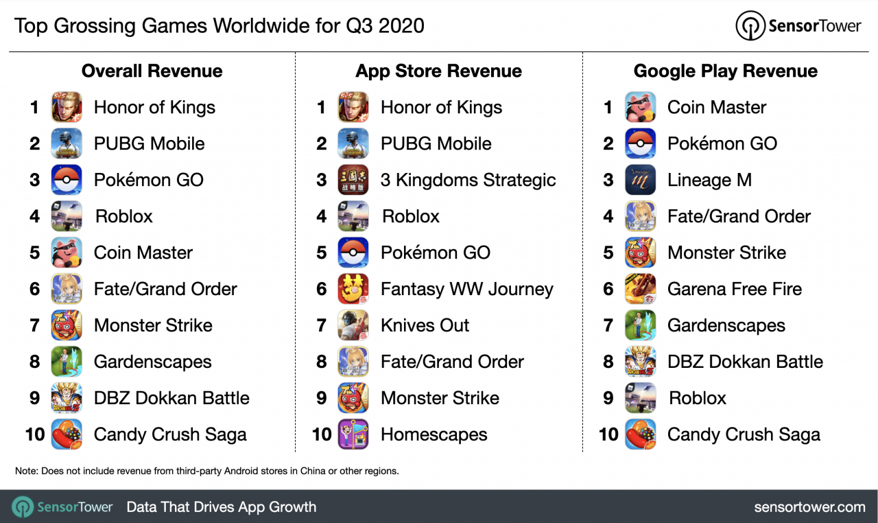 แอปเกมที่สร้างรายได้สูงสุดนั้นก็คือ Honor of Kings ตามด้วย PUBG Mobile, Pokemon Go, Roblox และ Coin Master