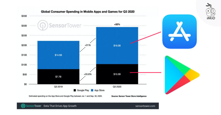 Sensor Tower เผยว่า ผู้ใช้จ่ายเงินในบริการซื้อภายในแอป, สมัครับ และจ่ายเงินซื้อแอปพรีเมียมใน App Store เพิ่มขึ้น 30% ในไตรมาส 3 ปี 2020 เพิ่มขึ้นจาก 14,500 ล้านดอลลาร์เป็น 19,000 ล้านดอลลาร์