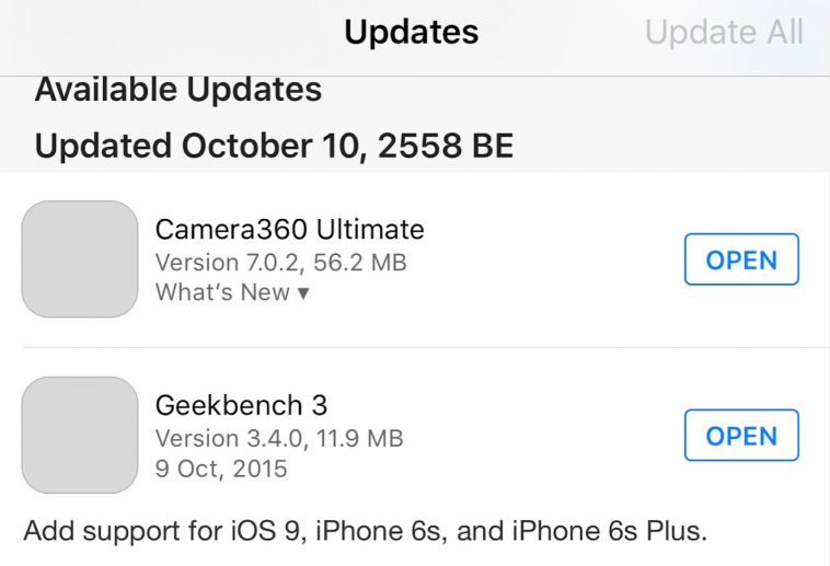 ผู้ใช้งานหลายคนแจ้งว่า App Store ใน iOS 9 ที่แถบ Updates พบโลโก้ของแอปพลิเคชันไม่แสดง หลังกดอัปเดตแล้วก็ไม่แสดงเช่นกัน
