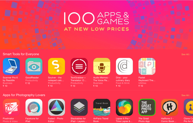 เรียกง่ายๆ อีกชื่อว่า “100 Apps & Games” ซึ่งป็นคอลลเคชั่นใหม่ล่าสุดของ Apple ที่รวบรวมแอปพลิเคชั่นลดราคามากมายไม่ว่าจะเป็นแอปสำหรับเด็ก, ถ่ายรูป หรือเรื่องงานเอกสารต่างๆ รวมถึงเกมด้วย