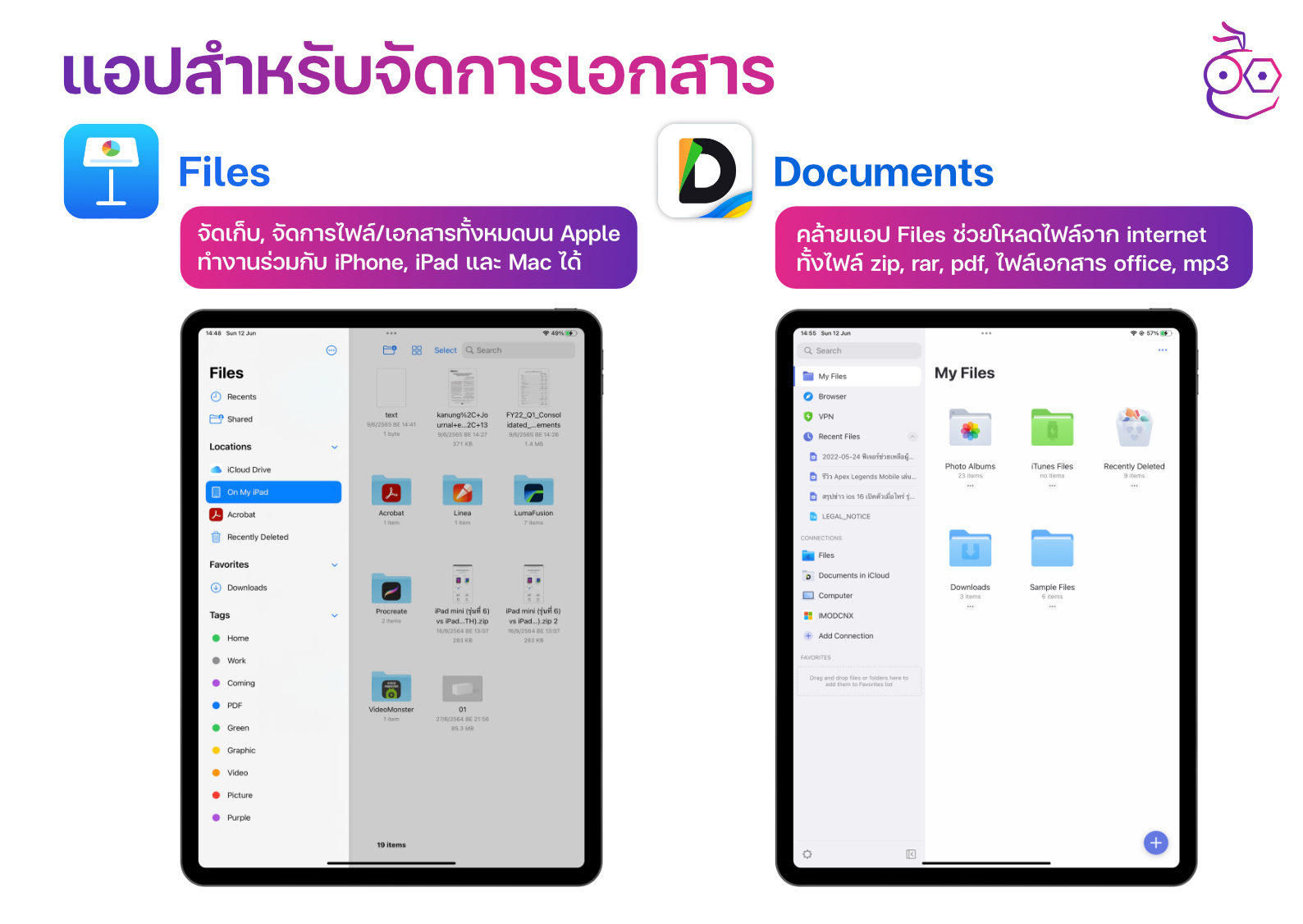 2. Documents – เป็นแอปสำหรับจัดการเอกสารที่คล้าย ๆ กับแอป Files ช่วยให้สามารถโหลดไฟล์จาก internet ไม่ว่าจะเป็น zip, rar, pdf, ไฟล์เอกสาร office หรือแม้กระทั่ง mp3 ลงเครื่อง iPad ของเราได้ และที่สำคัญคือโหลดฟรี!