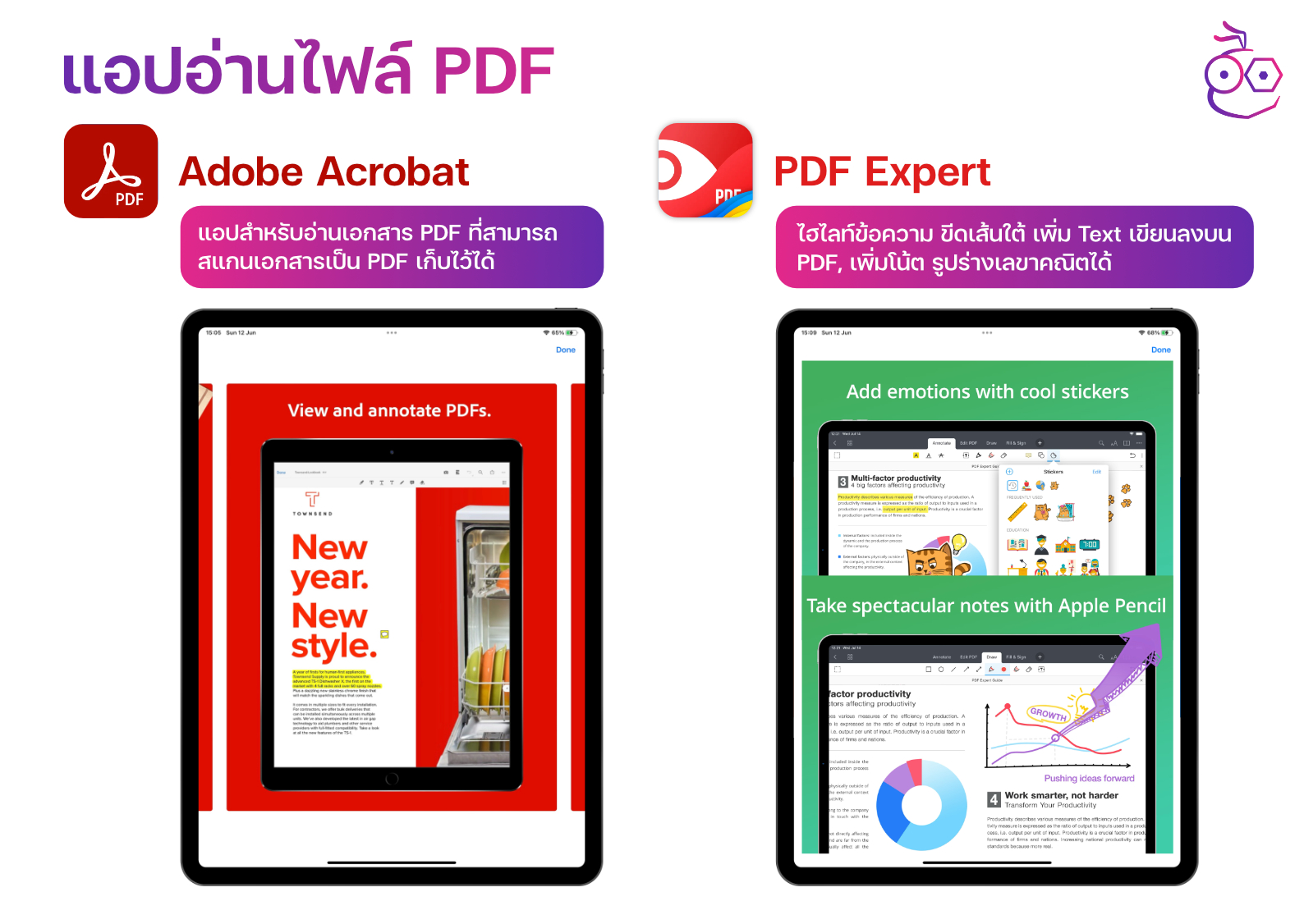 2. PDF Expert: PDF Editor, Reader – เป็นแอปอ่าน PDF ที่สะดวกครบครัน สามารถไฮไลท์ข้อความ ขีดเส้นใต้ เพิ่ม Text ขีดเขียนลงบน PDF หรือจะเพิ่มโน้ต เพิ่มรูปร่างเลขาคณิตได้ และยังมีสติ๊กเกอร์ภายในแอป ทำให้สามารถเพิ่มความน่าอ่านของ PDF ได้มากขึ้นเลยทีเดียว