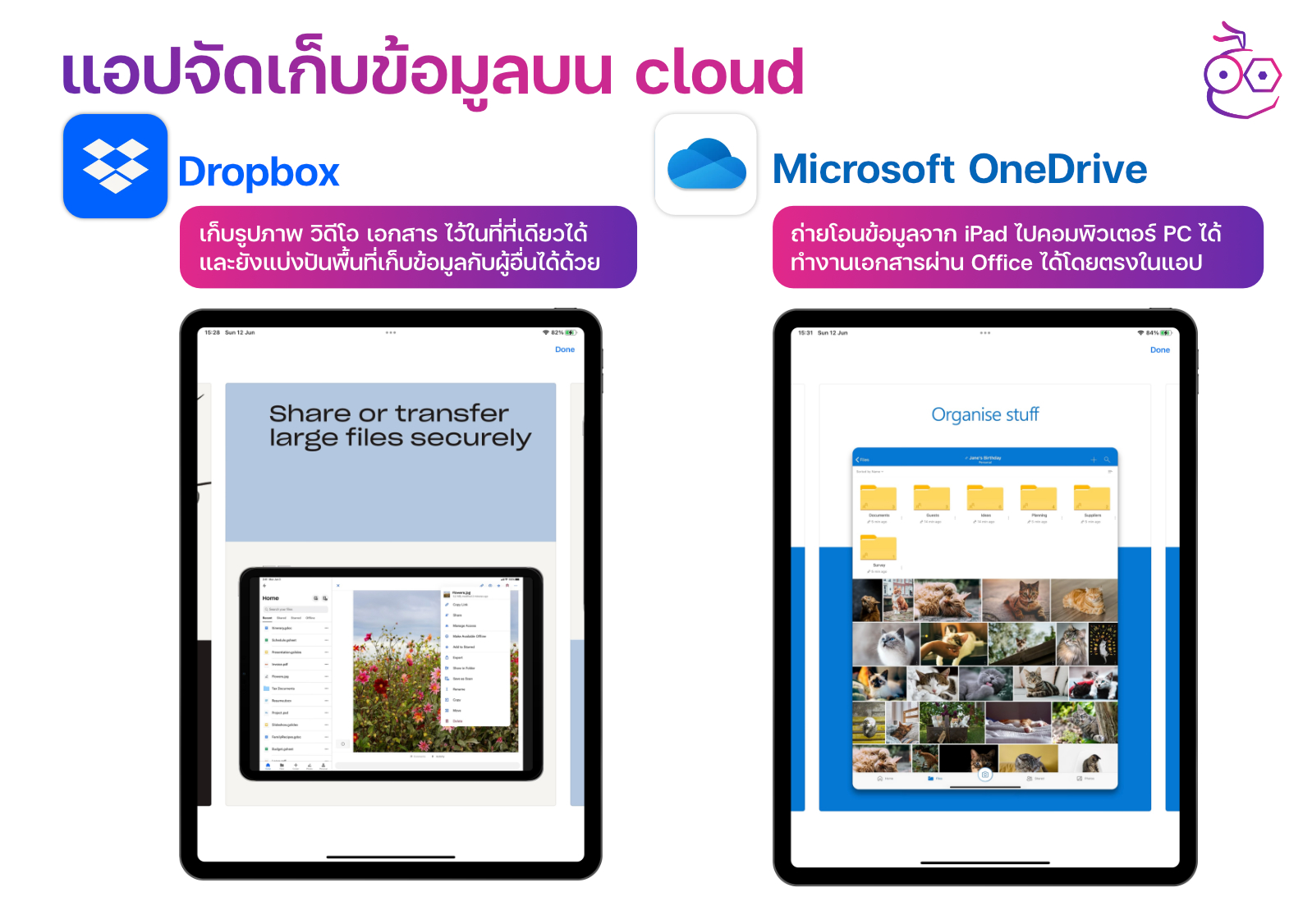 3. Microsoft OneDrive – เป็นบริการพื้นที่เก็บข้อมูลบน cloud ของ Microsoft ที่สามารถถ่ายโอนข้อมูลระหว่าง iPad ไปยังคอมพิวเตอร์ PC ได้ ถ้าเราสมัครใช้งาน และแอป OneDrive สำหรับ iPad สามารถทำงานเอกสารผ่าน Office ได้โดยตรงในแอป และยังสามารถเข้าถึงไฟล์ได้แบบออฟไลน์อีกด้วย
