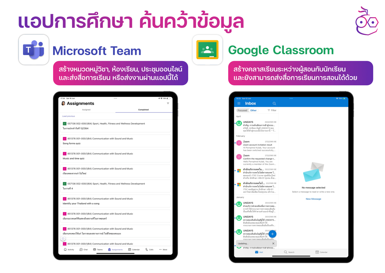 6. Microsoft Team – เป็นแอปสำหรับการศึกษาโดยเฉพาะ สามารถสร้างหมวดหมู่วิชา ห้องเรียน คุยแชท นัดเรียนหรือประชุมออนไลน์ได้ อีกทั้งยังสามารถส่งสื่อการเรียนการสอนหรือส่งงานผ่านแอปนี้ได้ด้วย