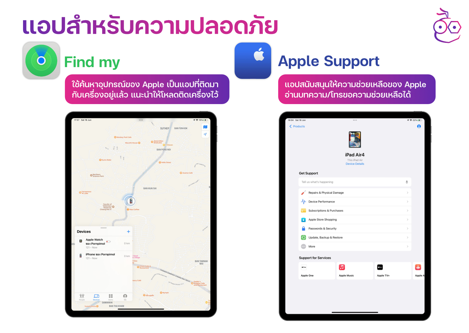 1. Find my – แอปสำหรับการค้นหาอุปกรณ์ของ Apple ทุกชิ้น ซึ่งเป็นแอปที่ติดมากับเครื่องอยู่แล้ว หากใครที่ใช้อุปกรณ์ชิ้นอื่นของ Apple อยู่แล้วก็แนะนำให้โหลดติดเครื่องไว้ หากเกิดเหตุ iPhone ของเราหายก็สามารถใช้ iPad ค้นหาได้