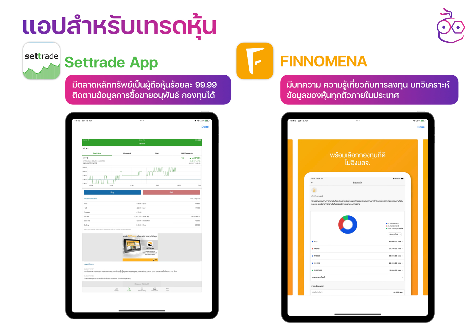 1. Settrade App – แอปนี้มีตลาดหลักทรัพย์แห่งประเทศไทยเป็นผู้ถือหุ้นร้อยละ 99.99 ของทุนจดทะเบียน เป็นแอปสำหรับผู้ที่มีความสนใจในการลงทุน สามารถติดตาม ข้อมูลการซื้อขายหลักทรัพย์ อนุพันธ์ กองทุน ข่าวสารการลงทุนหรือบทความที่น่าสนใจ นอกจากนี้ยังมีฟีเจอร์คำนวณผลกำไร-ขาดทุนย้อนหลังสำหรับการจำลองเล่นหุ้นด้วย ทำให้เหมาะกับมือใหม่ที่อยากลองเทรดก่อนลงสนามจริง