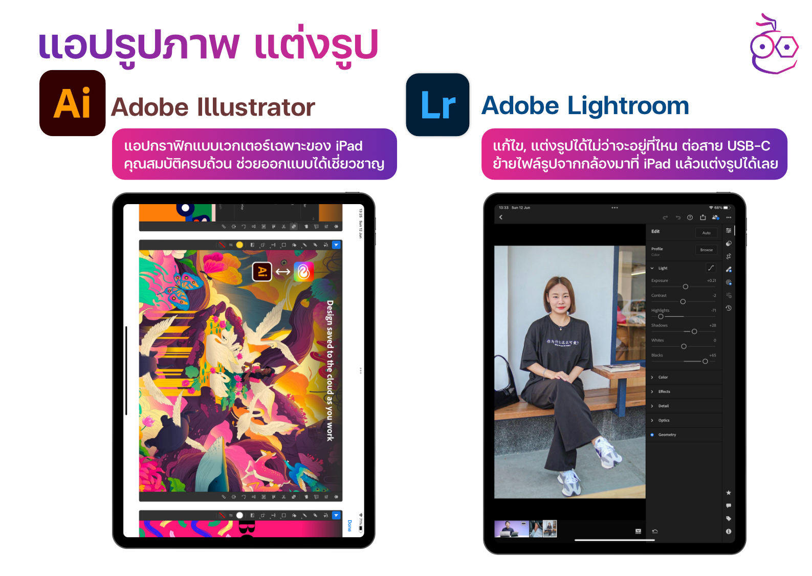 2. Adobe Lightroom – เป็นแอป work flow สำหรับภาพถ่ายดิจิทัล ที่เหล่าช่างภาพมืออาชีพหลายคนในปัจจุบันเลือกใช้ เพียงแค่มี iPad ก็สามารถแก้ไขหรือแต่งรูปได้ไม่ว่าจะนั่งทำงานอยู่ที่ไหน และที่สำคัญคือ สามารถเสียบสาย USB-C ย้ายไฟล์รูปภาพจากกล้องมาที่ iPad แล้วแต่งรูปได้เลย เรียกได้ว่า สะดวกมาก ๆ