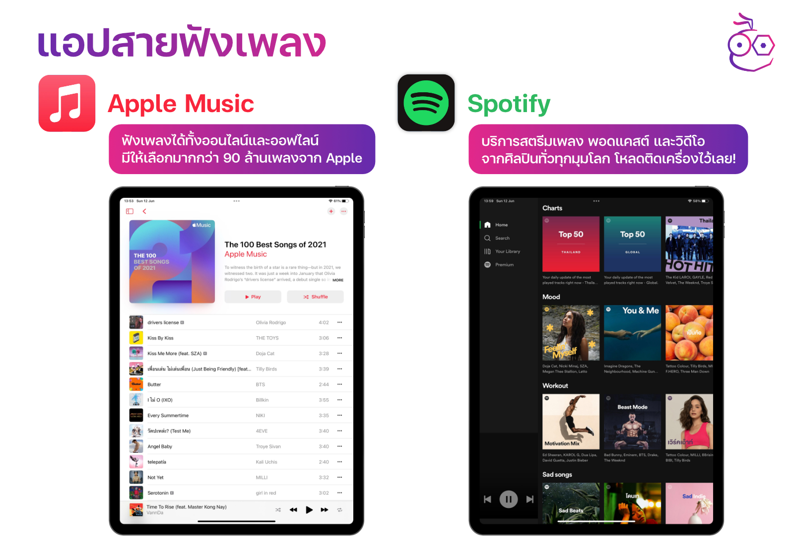 1. Apple Music – เป็นบริการฟังเพลงออนไลน์และออฟไลน์จาก Apple ที่มีเพลงให้เลือกฟังมากกว่า 90 ล้านเพลง รองรับการฟังผ่านหลายช่องทางทั้ง iPhone, iPad และอุปกรณ์อย่าง Apple Watch ก็ทำได้ มีเพลงให้เลือกฟังหลากหลายทั้งไทยและสากล เลือกฟังจาก Playlist ต่าง ๆ พร้อมทั้งฟังรายการวิทยุสด ๆ ที่มี DJ ชื่อดังมาจัดรายการอีกด้วย