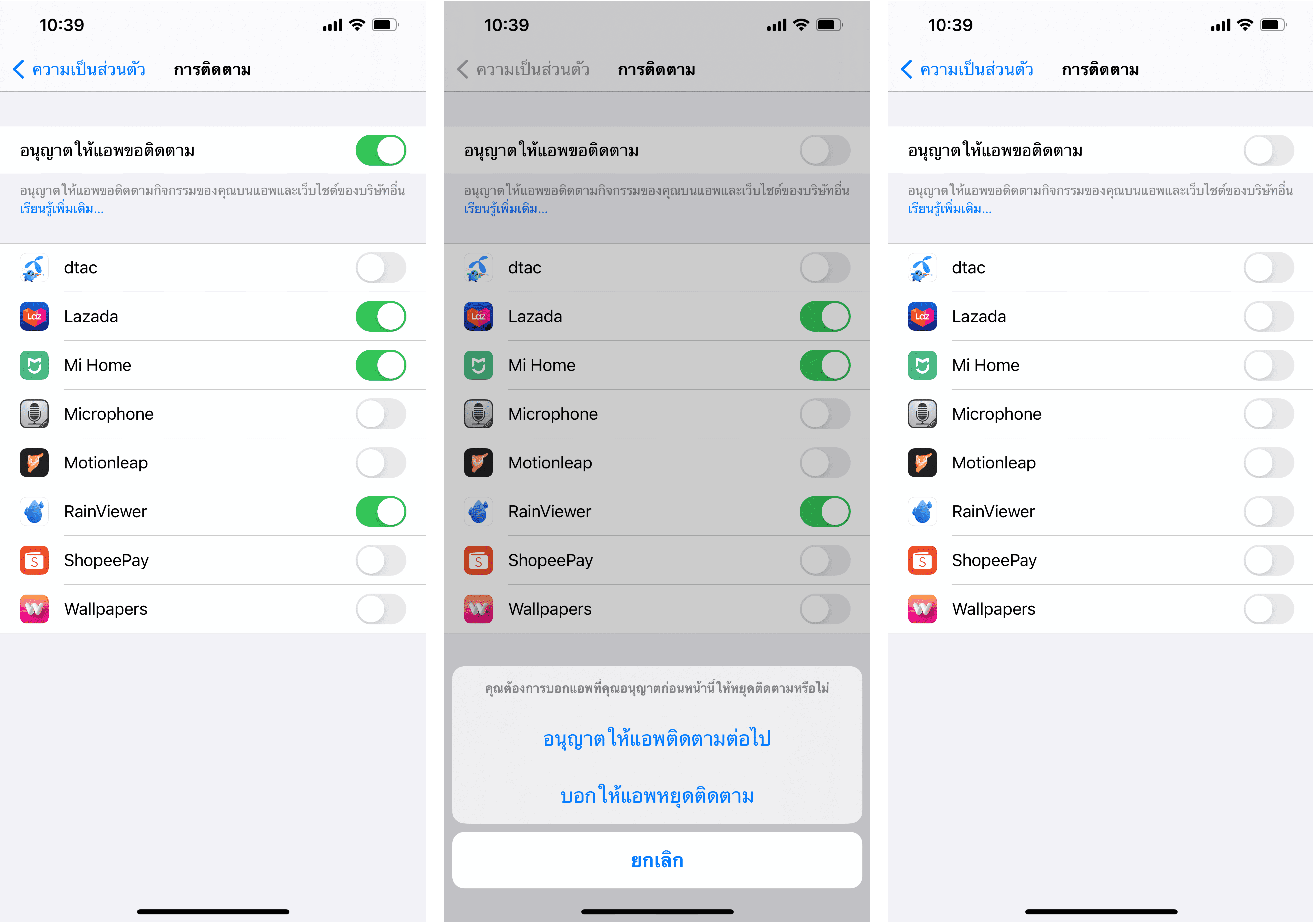 แต่ถ้าหากเลื่อนปิดการอนุญาตให้แอปขอติดตาม ในขณะที่แอปยังติดตามข้อมูลอยู่ ระบบจะแจ้งให้ผู้ใช้เลือกว่าจะให้แอปเหล่านั้นหยุดติดตาม หรืออนุญาตให้ติดตามข้อมูลผู้ใช้ต่อ