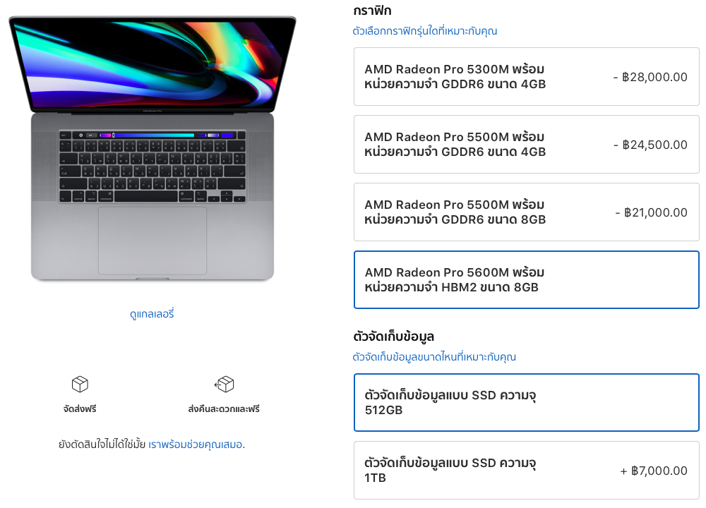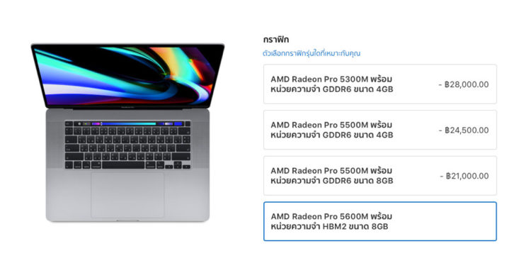 ในการปรับแต่ง MacBook Pro 16 นิ้ว ผู้ซื้อสามารถเลือกกราฟิก AMD Radeon Pro 5600M HBM2 ขนาด 8GB ได้แล้ว ราคาราว ๆ 28,000 บาท