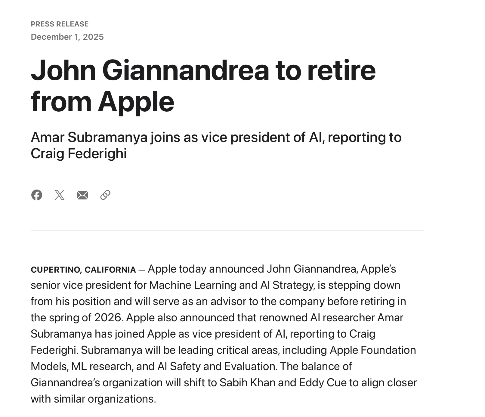Apple ประกาศว่า John Giannandrea หัวหน้าทีม AI ของ Apple เตรียมเกษียณในช่วงฤดูใบไม้ผลิปี 2026 (กลางปีหน้า) หลังมีรายงานมาตลอดว่า Siri ล่าช้า ส่งผลต่อโครงสร้างองค์กรและแผนพัฒนา AI ของบริษัท