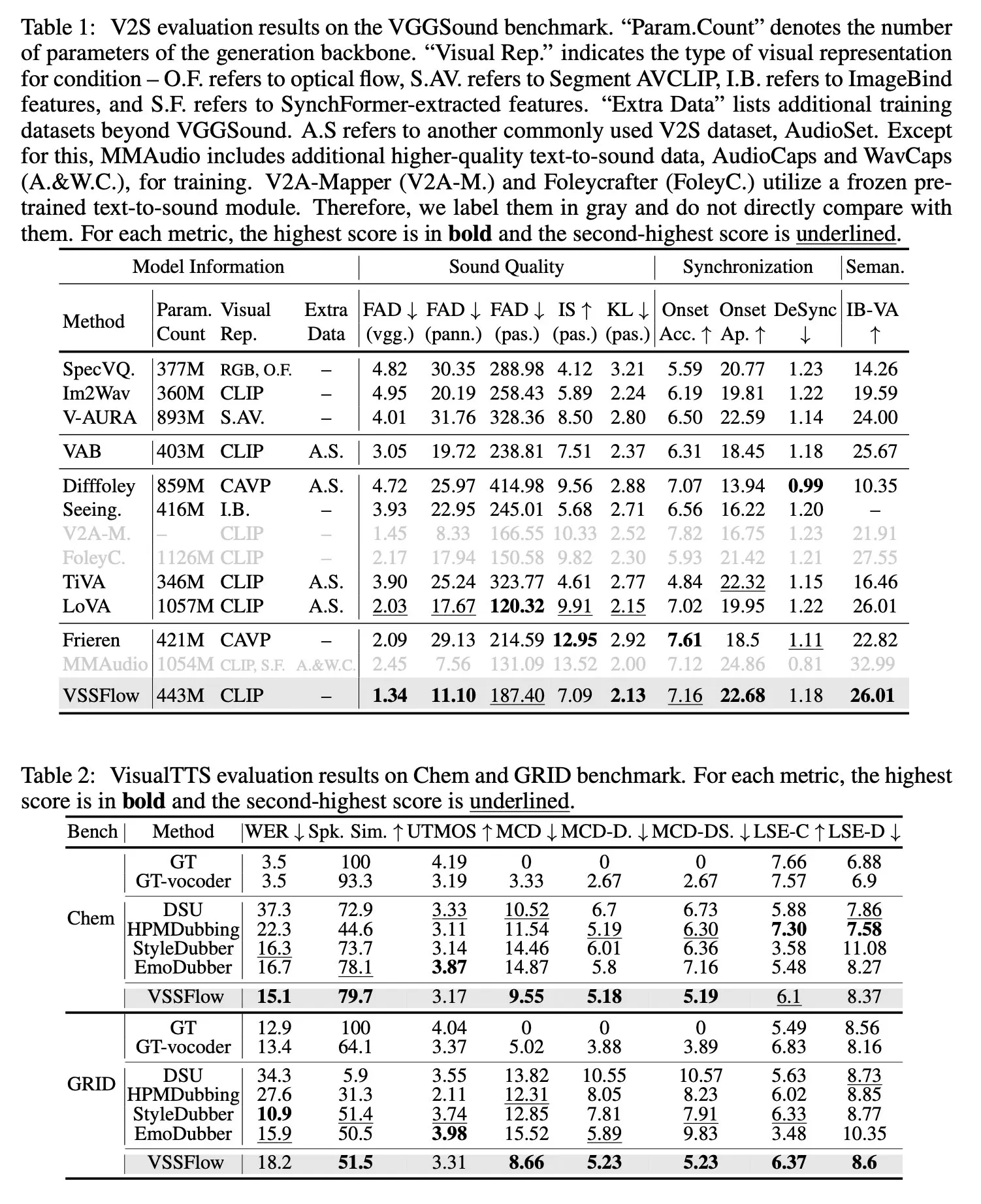พบว่า VSSFlow ให้ผลลัพธ์ที่ทัดเทียม ในทั้งสองงาน และยัง ทำคะแนนนำในตัวชี้วัดสำคัญหลายด้าน ทั้งที่ใช้เพียง ระบบรวมศูนย์ระบบเดียว