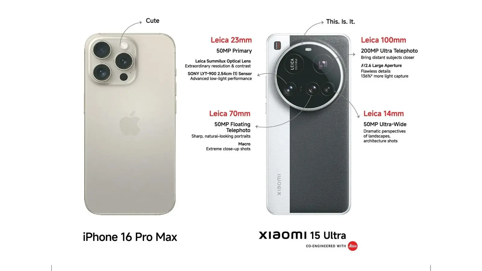 ก่อนหน้านั้นในเดือน มี.ค. 2025 มีโฆษณาเปรียบเทียบเรื่องกล้อง 3 เลนส์ของ iPhone 16 Pro Max ว่า “น่ารัก” และมีการตั้งคำถามว่านี่คือ “สิ่งที่ดีที่สุดจริงหรือ” (แนวประชดประชัน) พร้อมแสดงความเหนือกว่าของ Ultra ในด้านสเปคกล้องที่สูงกว่า และราคาที่ถูกกว่า, นอกจาก Apple แล้ว Xiaomi ได้ทำแคมเปญลักษณะเดียวกันกับ Samsung