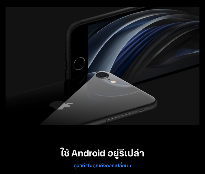 ในช่วงท้ายของหน้าเว็บภาพรวม iPhone SE (รุ่นที่ 2) จะมีข้อความระบุว่า “ใช้ Android อยู่รึเปล่า ดูว่าทำไมคุณถึงควรเปลี่ยน”
