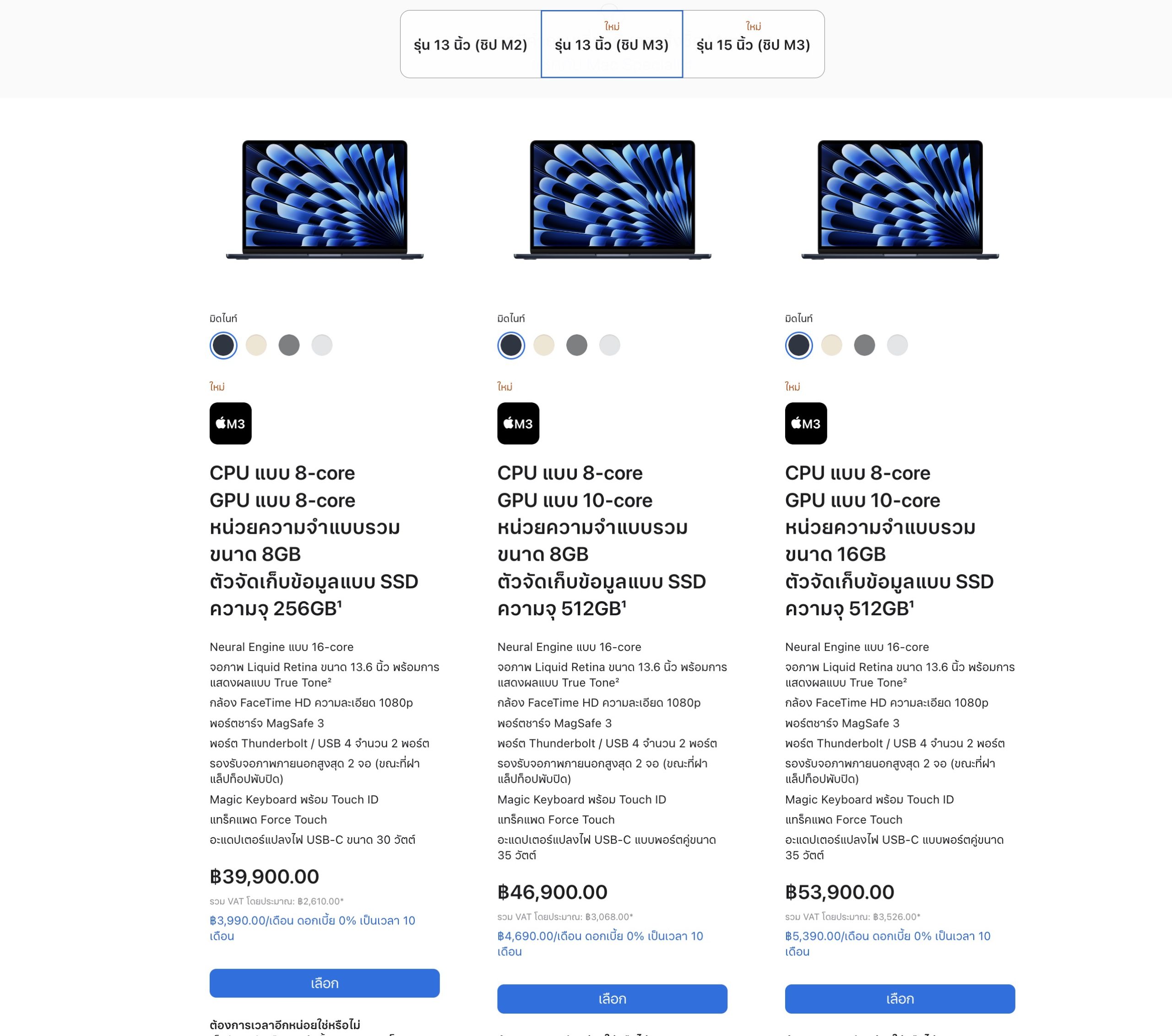 Apple เปิดตัว MacBook Air รุ่นใหม่ 13″ และ 15″ มาพร้อมชิปประมวลผล M3 มีประสิทธิภาพสูงขึ้น โดยรุ่น 13″ ราคาเริ่มต้น 39,900 บาท ส่วนรุ่น 15″ เริ่มต้น 47,900 บาท